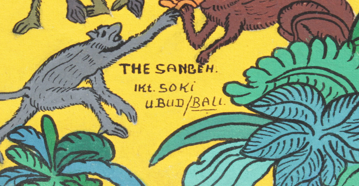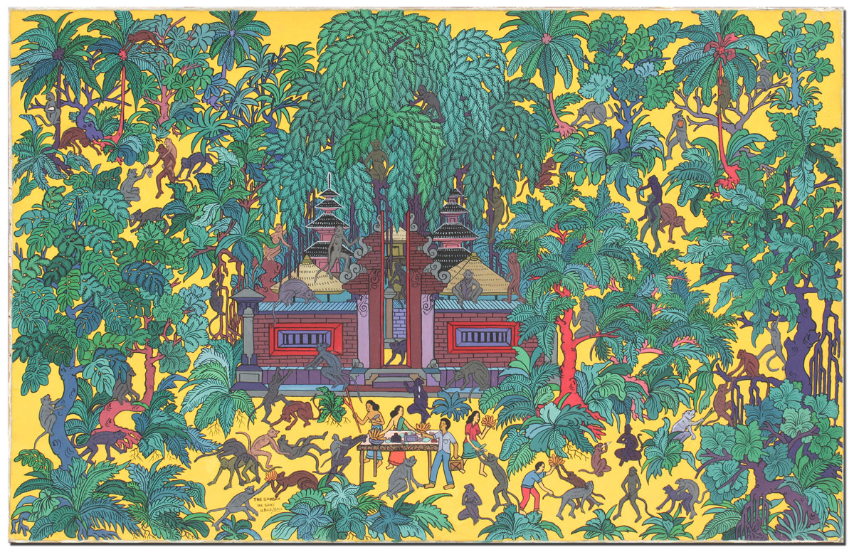 BALINESE JUNGLE FESTIVAL PAINTING WITH MONKEYS: Oil/Canvasboard, 34 3/4'' x 55 1/8'', signed in the lower margin ''The Sanbeh Lkt Soki Ubud/Bali'', unframed.