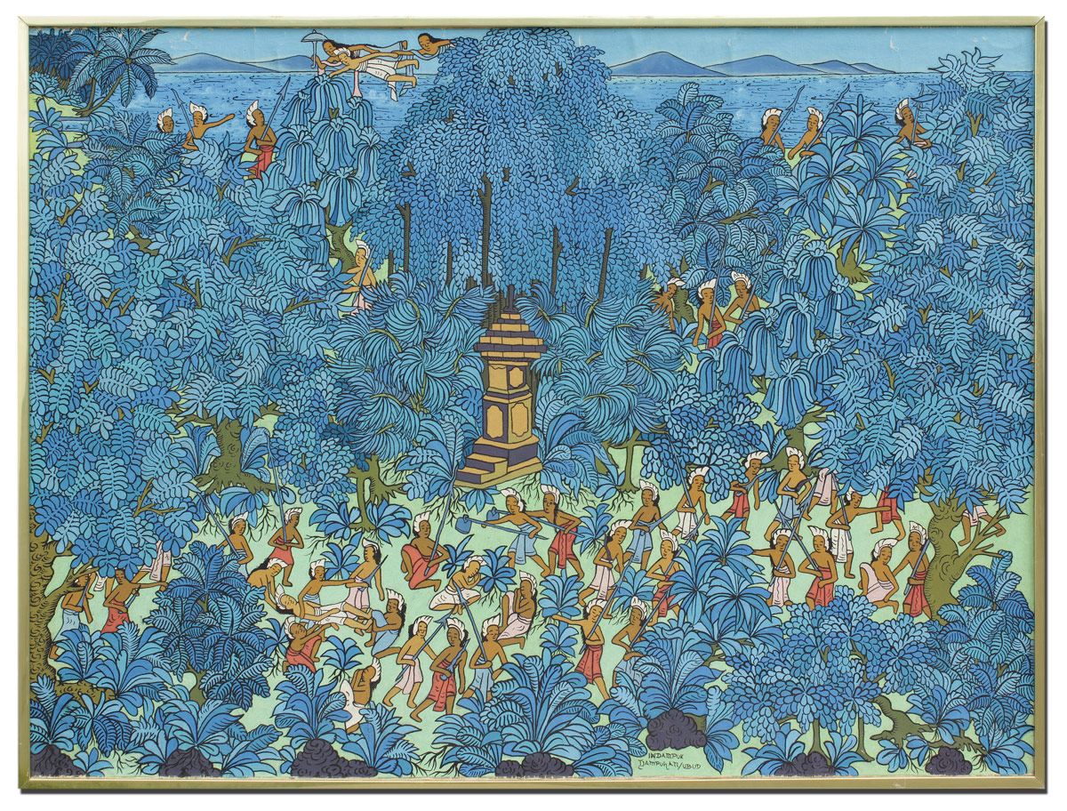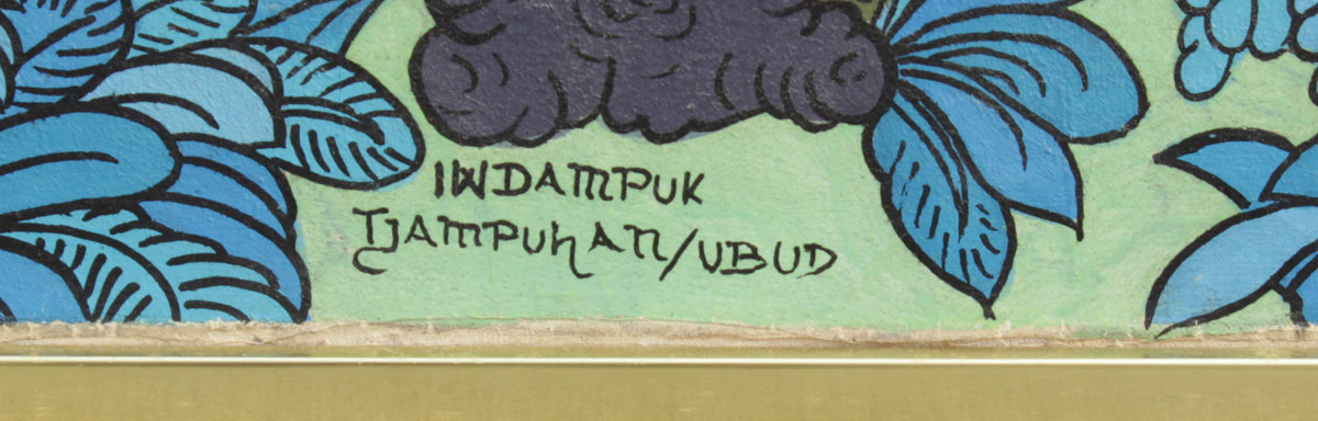 BALINESE JUNGLE SCENE WITH FESTIVAL PAINTING: Oil/Canvasboard, 34 3/4'' x 46 1/4'', signed in the lower margin Iwdampuk Tjampuhan-Ubud, encased in modern metal frame with wear 35 3/4'' x 47''.
