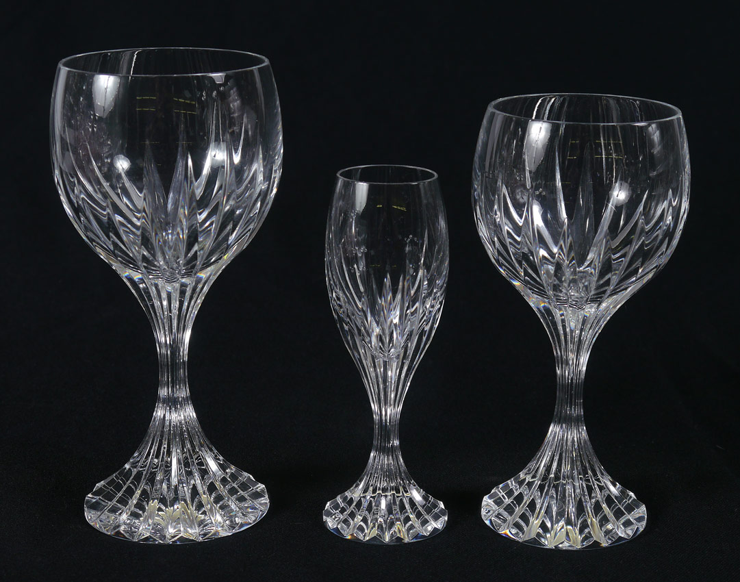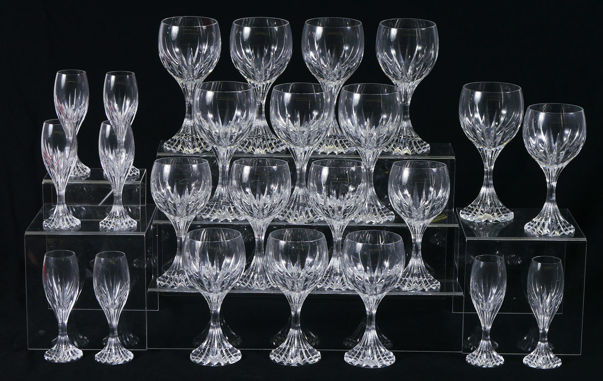 24 PIECE BACCARAT MASSENA CRYSTAL STEMWARE: 24 pieces in the Massena pattern to include 8 water goblets (7''), 8 claret wine (6 3/8''), 8 cordials (5 3/8'').