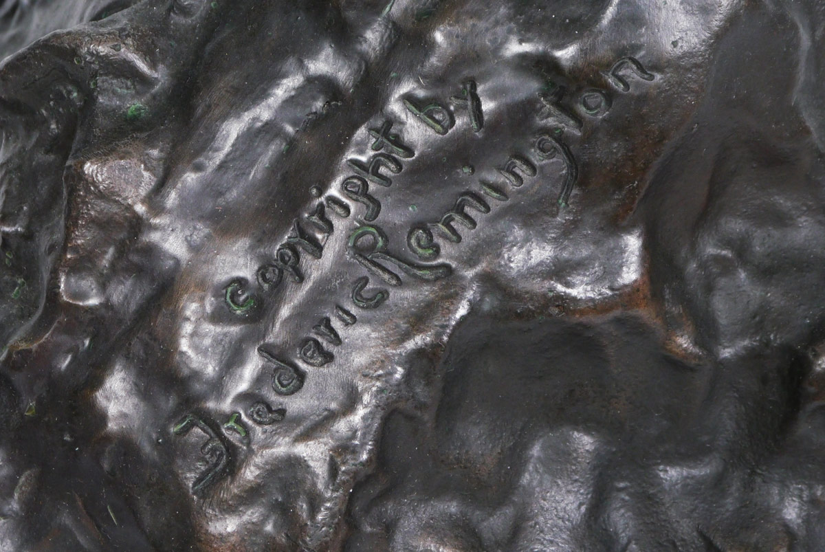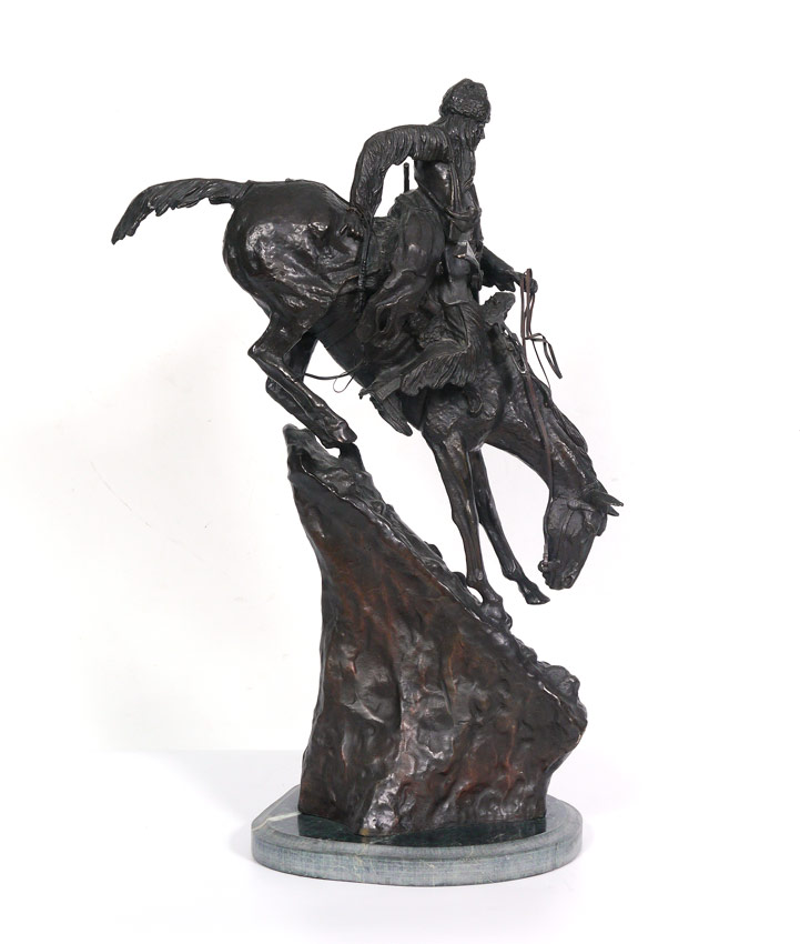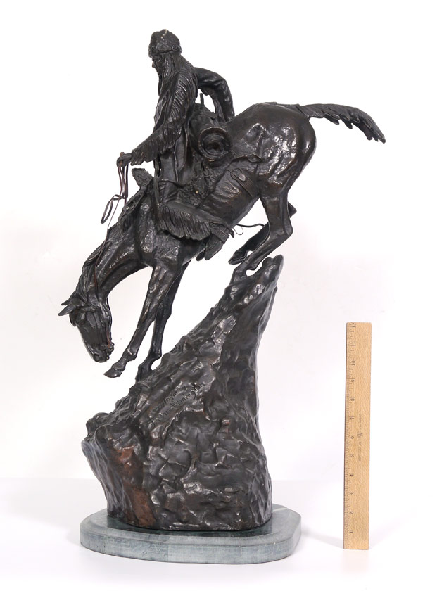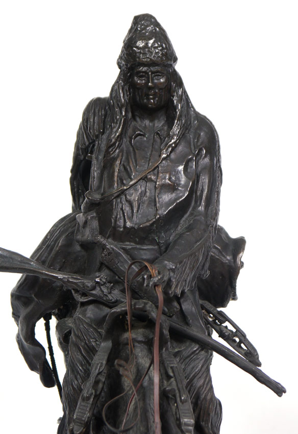LARGE MOUNTAIN MAN BRONZE AFTER REMINGTON: Approximately 27'' h., affixed to a beveled marble plinth, overall 28 1/2'', this is an older casting of better quality and patina.
