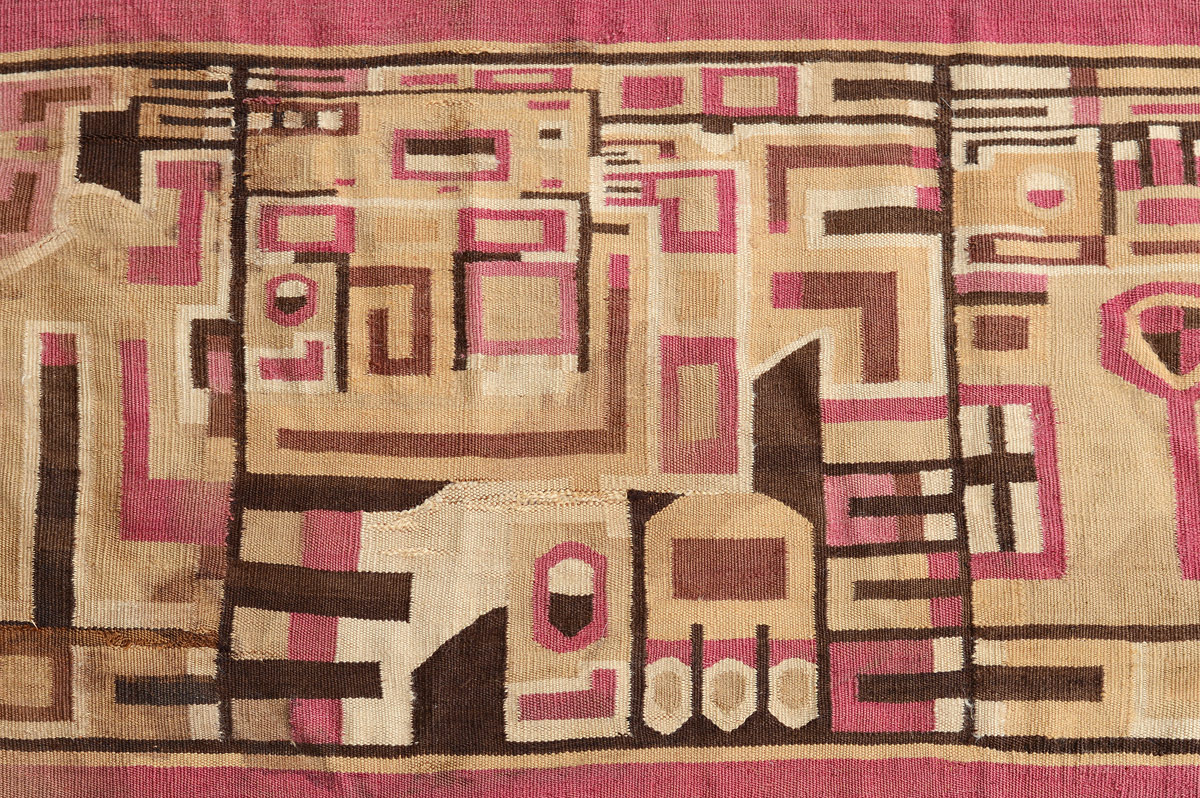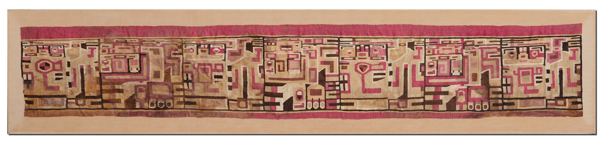 RARE PRE-COLUMBIAN RED, BROWN, AND BEIGE WOVEN TEXTILE FRAGMENT: From Tiahucinaco, Wari Culture, South Coast, abstractly woven in red, brown, and beige, in geometric form with jaguars amidst landscape, mounted on a linen and wood backing, 9 1/2'' x 55 1/2'', circa A.D. 600-1,000.
