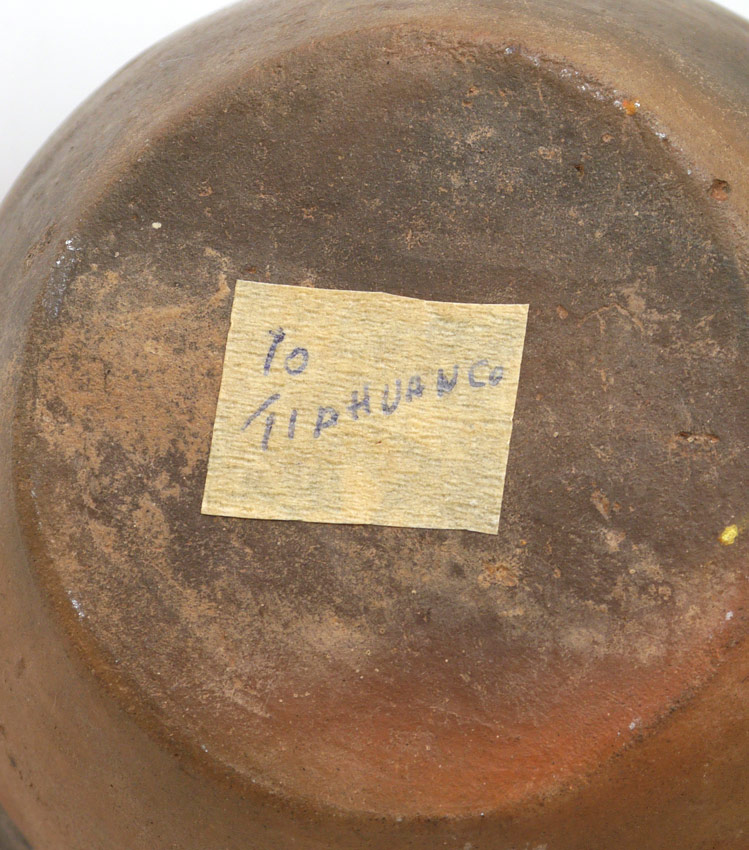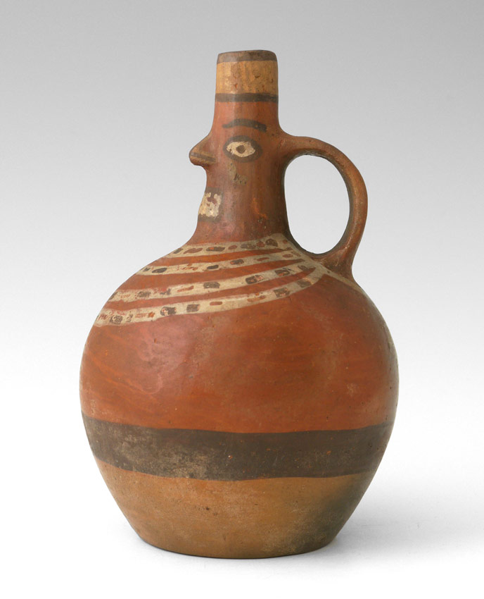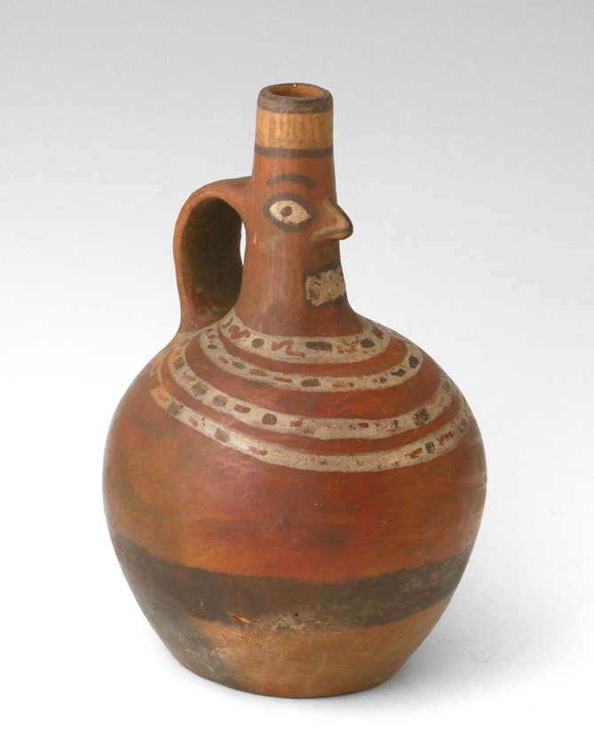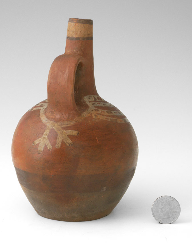 PERUVIAN BIRD FORM JUG: With handle on one side, marked with tape on the bottom ''10 Tiahuanaco'', 7 1/4''.