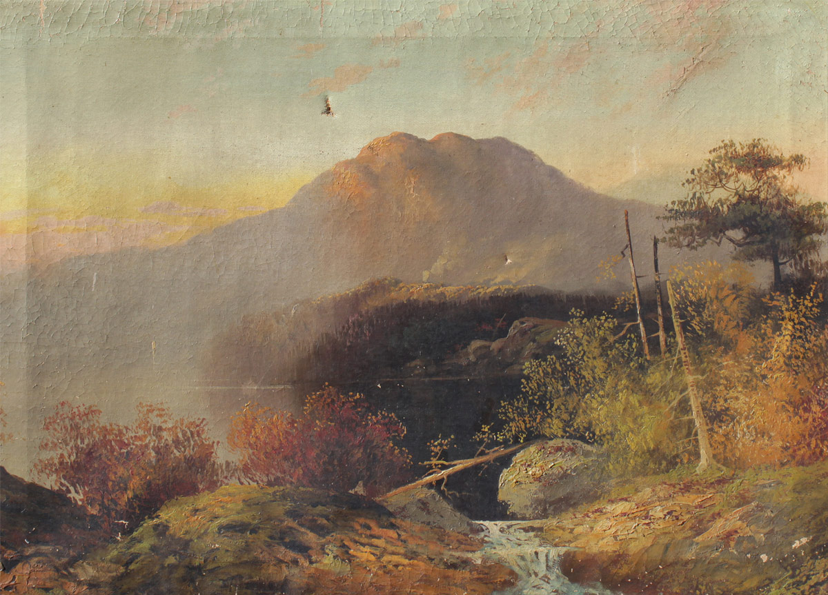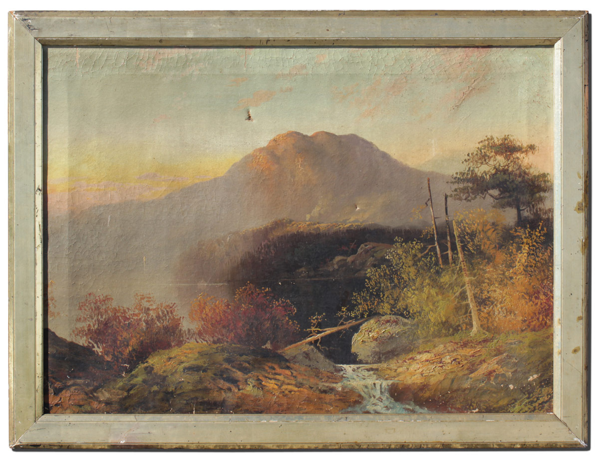 LATE 19TH/EARLY 20TH CENTURY HUDSON RIVER SCHOOL STYLE PAINTING: Depicts a Peaceful River Scene with Looming Mountain Background, Oil/Canvas, 21 1/2'' x 30'', no visible signature, encased in gilded period liner with wear 25 1/4'' x 34''.