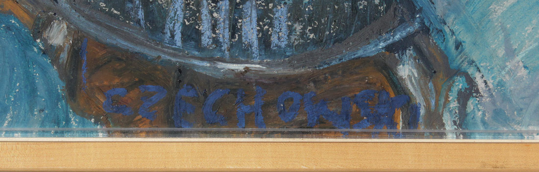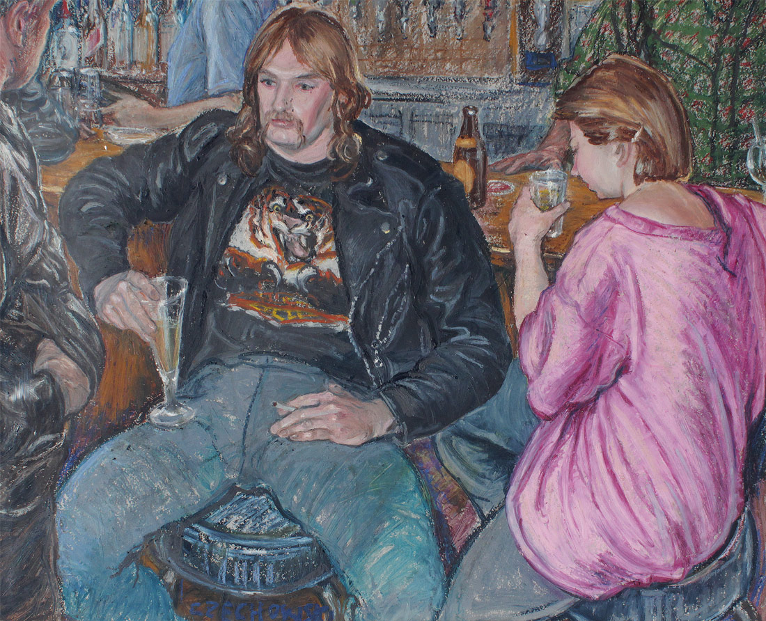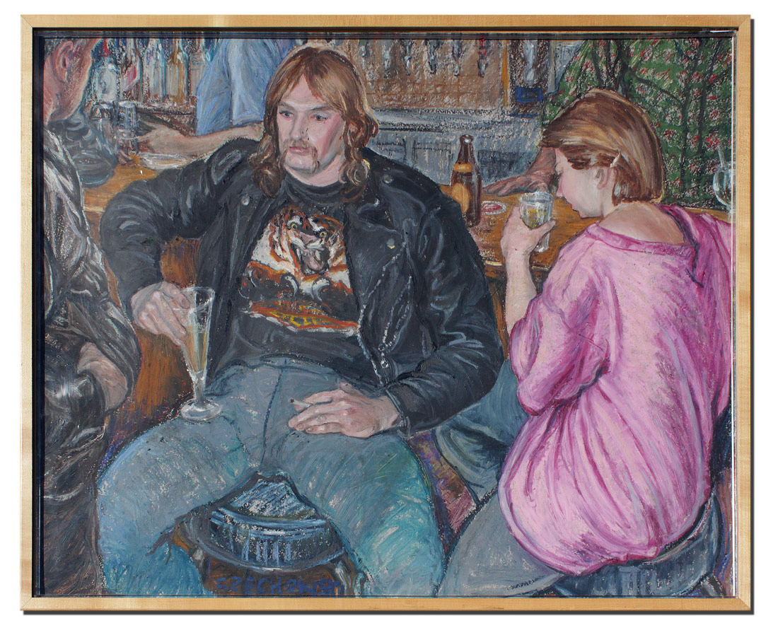 CZECHOWSKI, Alicia, (American, 1953-): Interior Bar Scene with Figures Seated at the Bar, Oil/Paper, sight size 29 1/2'' x 37 1/4'', signed lower left, encased in heavy elaborate log style wood frame 47'' x 55 1/4''.