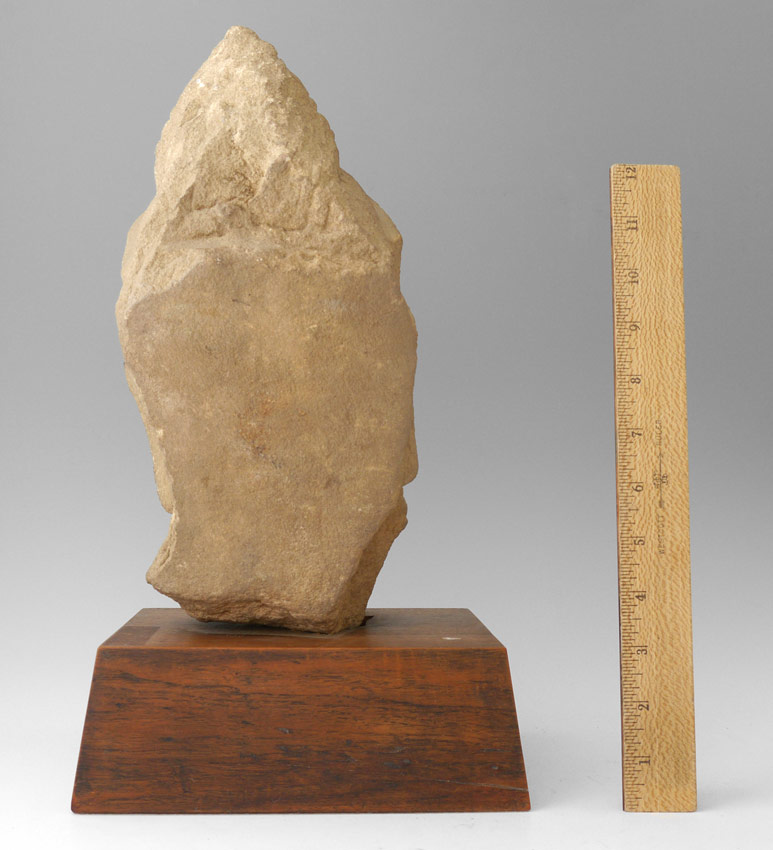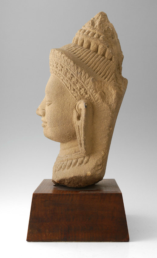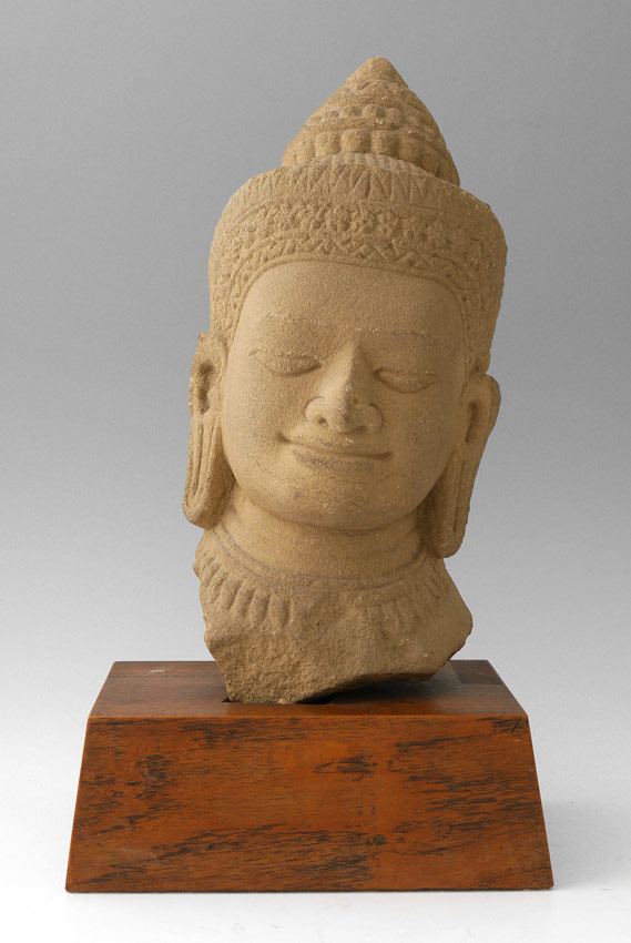 KHMER CARVED SANDSTONE HEAD OF BUDDHA: Lopburi period, circa 13th Century A.D., carved with lobed ushnisa foliate decorated diadem, low browed almond form eyes, prominent nose with flared nostrils, wide smiling mouth and pendent lobed ears, wearing a double ring scalloped collar, mounted on a wooden base, overall measures 15'' h. x 8 1/2'' x 6 1/2''.