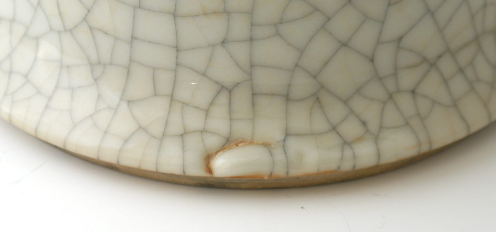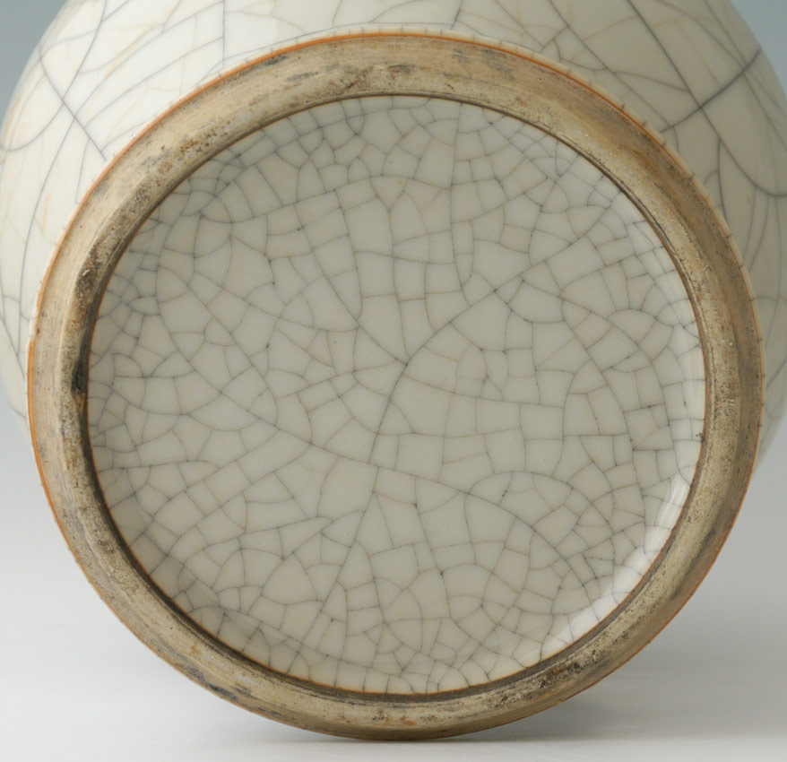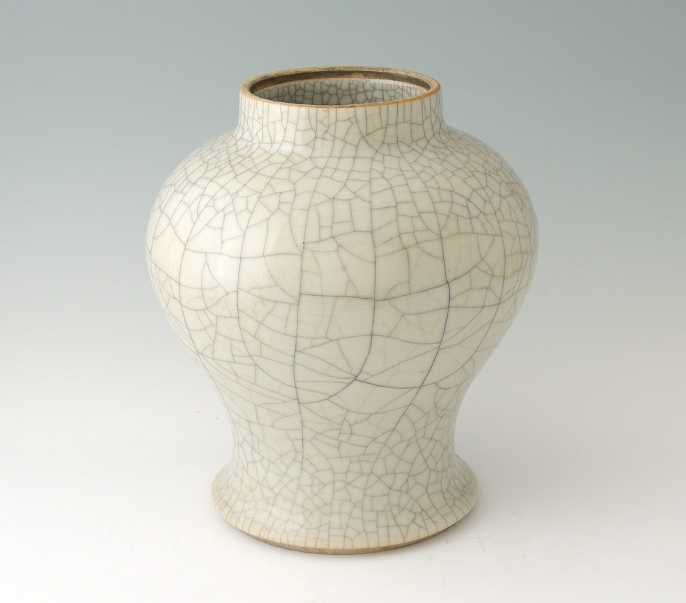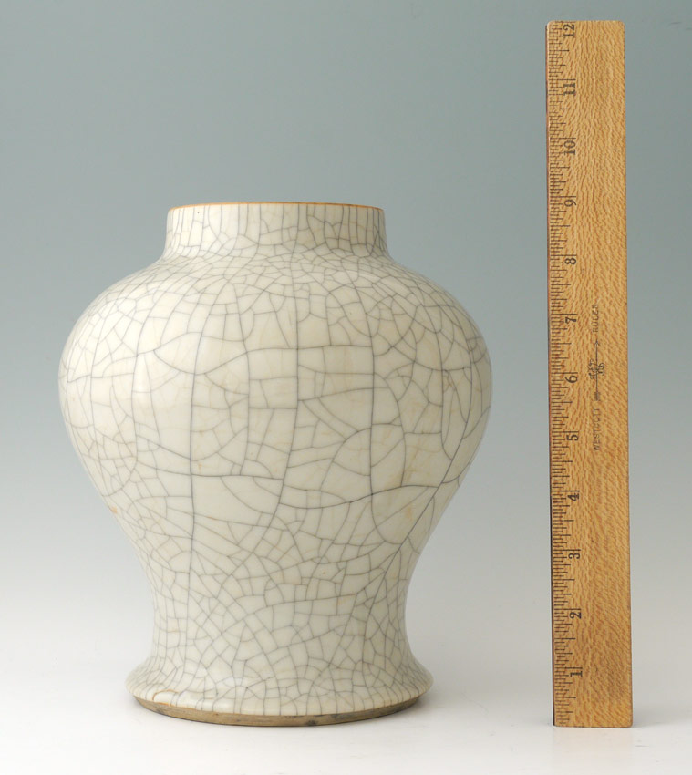 CHINESE BALUSTER CRACKLE GLAZE VASE: Baluster form with ink stained white crackle glaze all over, unmarked as to dynasty, actual age unknown. Measures 9'' h. x 8''.