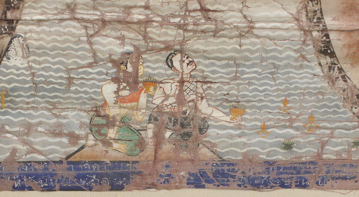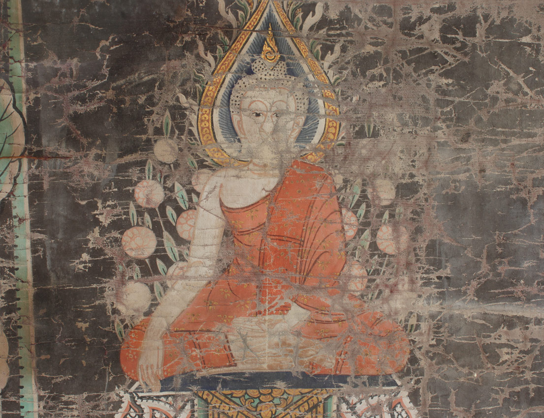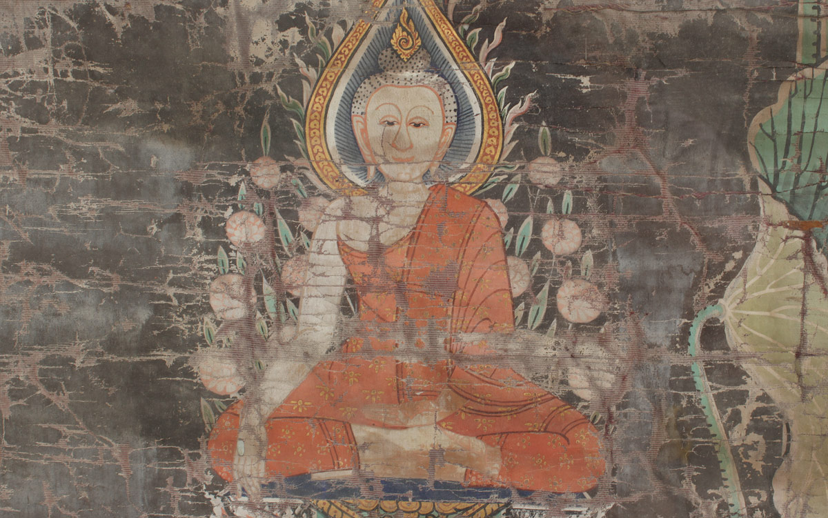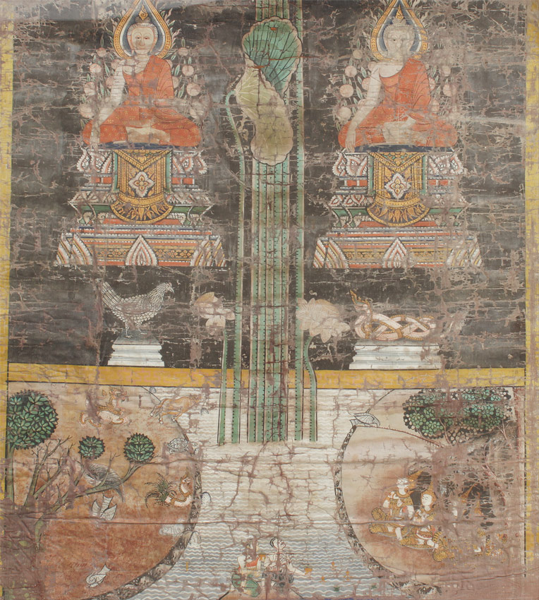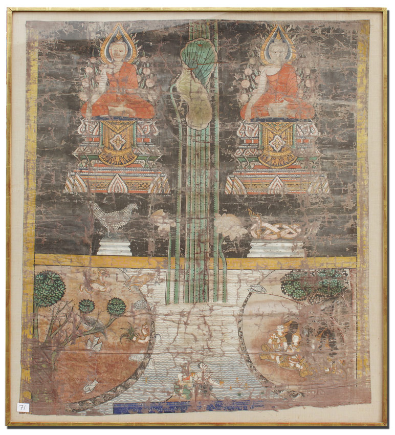 THAI POLYCHROME AND GILT PAINTED THANKA: Painted with two figures of Avalokitesvara seated cross-legged in dhyanasana and bhumisparsa mundra, on lotus thrones with mythical animals, arhats, and attendants seen in a landscape reserve. Oil/Canvas, un-stretched but laid down on backing 41'' x 45 1/2'', gilded frame with wear 43 1/2'' x 39 1/2''.