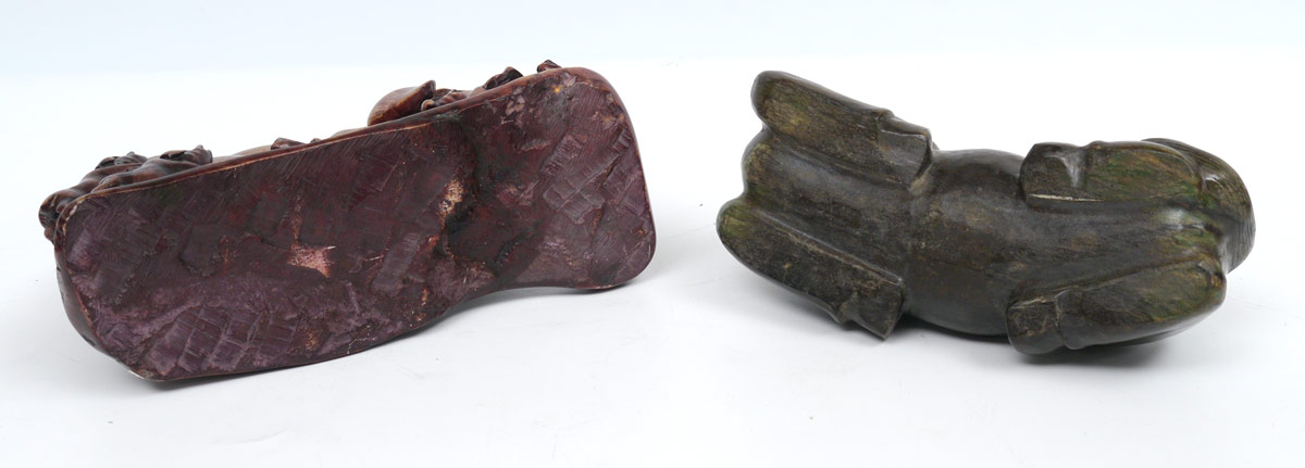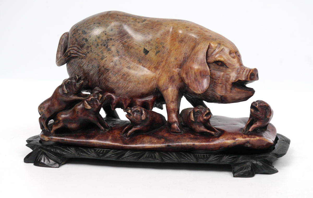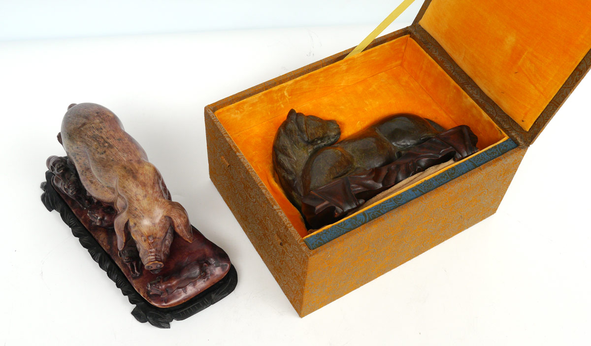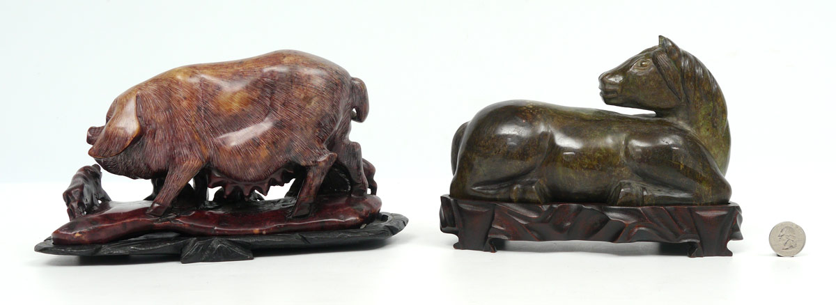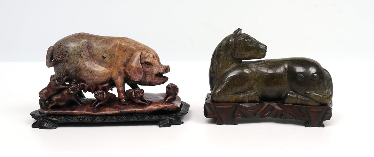 2 PIECE ORIENTAL CARVED STONE HORSE & PIG: 2 pieces to include 1) Carved hard stone recumbent horse on carved wood stand. Horse measure 4 3/4'' h. x 7 3/4'' x 3 1/2''. Sold with fitted presentation box, 5 1/4'' h. x 10 3/4'' x 8 1/4''. 2) Soapstone carved sow pig with piglets, 5 1/4'' h. x 9 1/4'' x 3 1/2''.