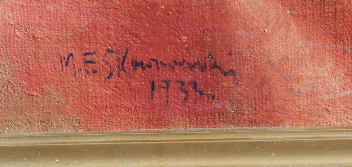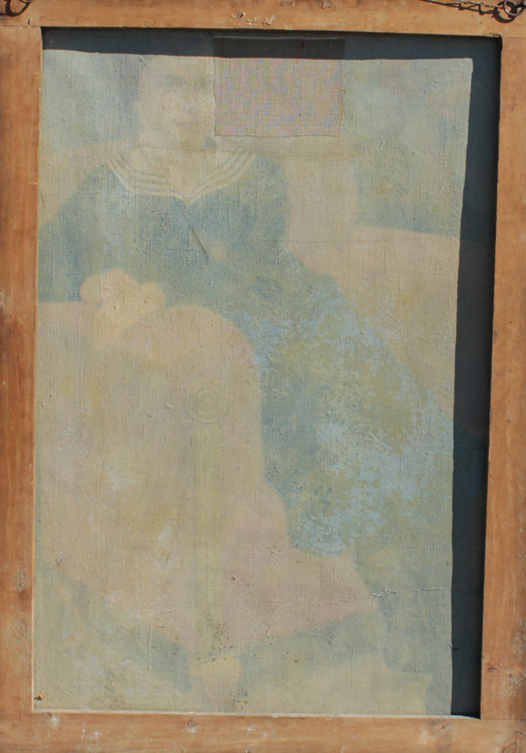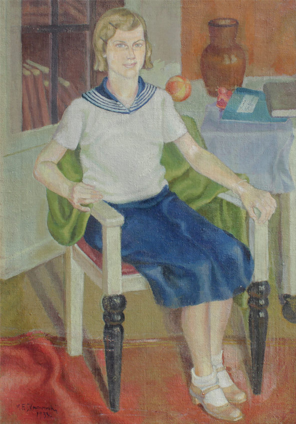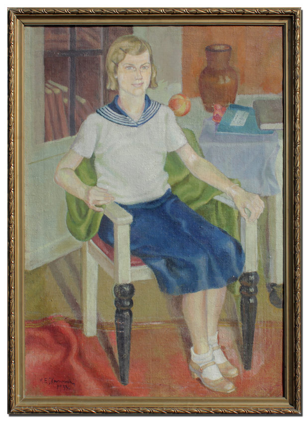 ILLEGIBLY SIGNED MODERNIST PORTRAIT PAINTING: Depicts a Young Woman Seated on an Arm Chair in an Interior, Oil/Canvas, 45 1/4'' x 31 3/4'', signed lower right, dated 1933, signature appears to be European, encased in a gilded frame with wear and gold overpaint 48 1/2'' x 35 1/4'', it should be noted there is another painting verso.