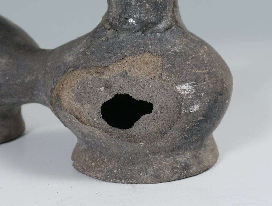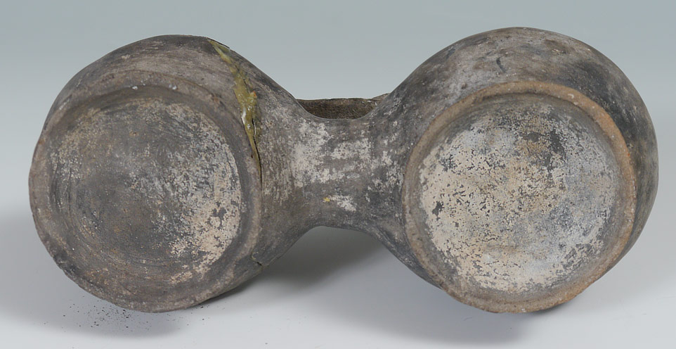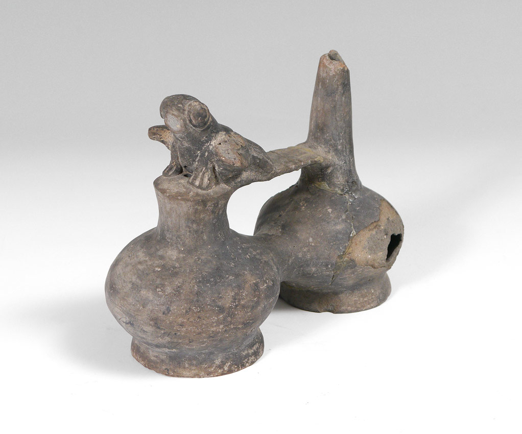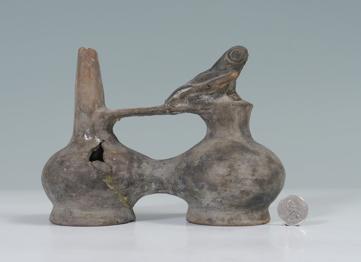 PRE-COLUMBIAN FIGURAL DOUBLE VESSEL: Double chambered Peruvian vessel with figural bird effigy. Overall measures 5 3/4'' h. x 7 3/4'' x 3 1/2''.