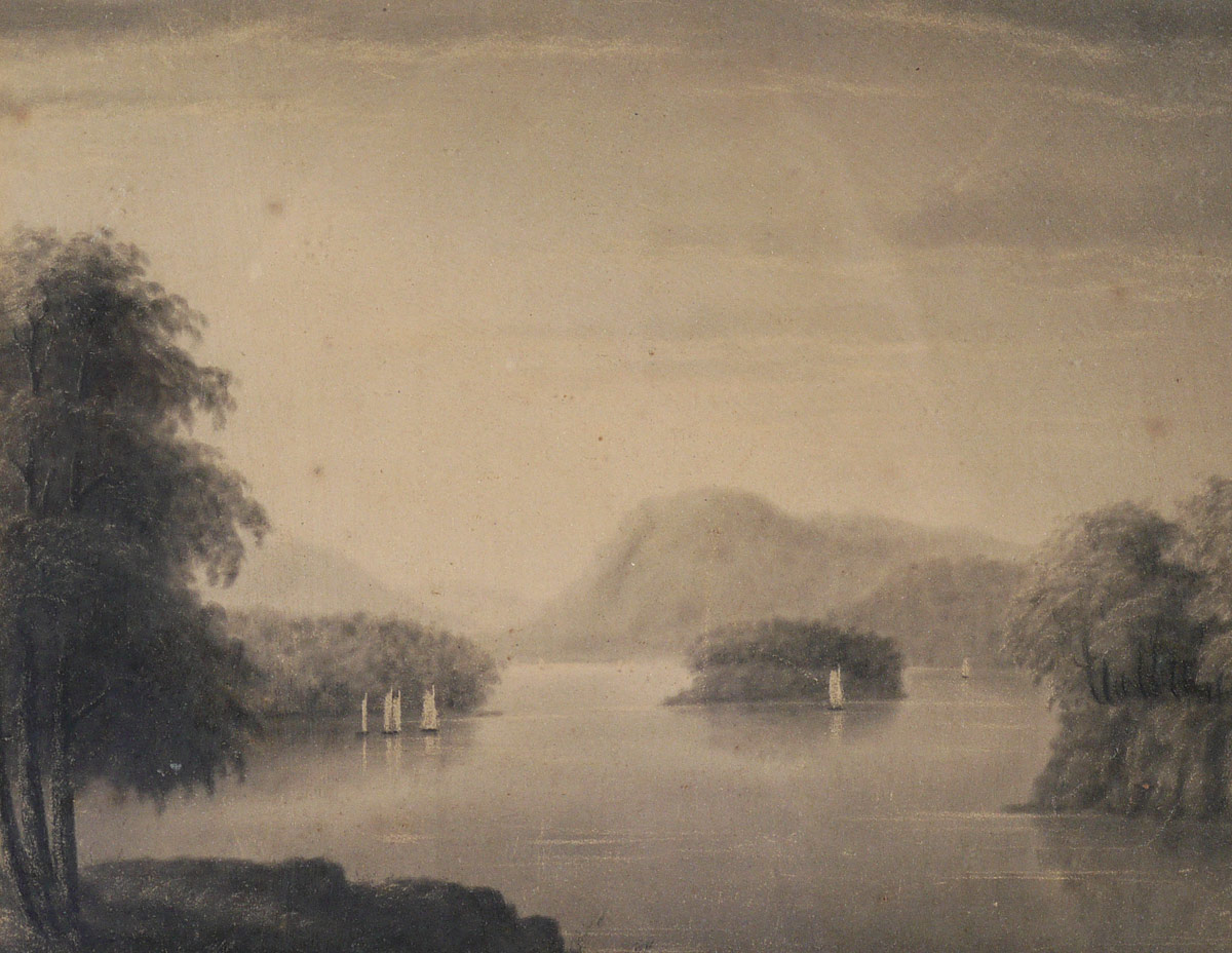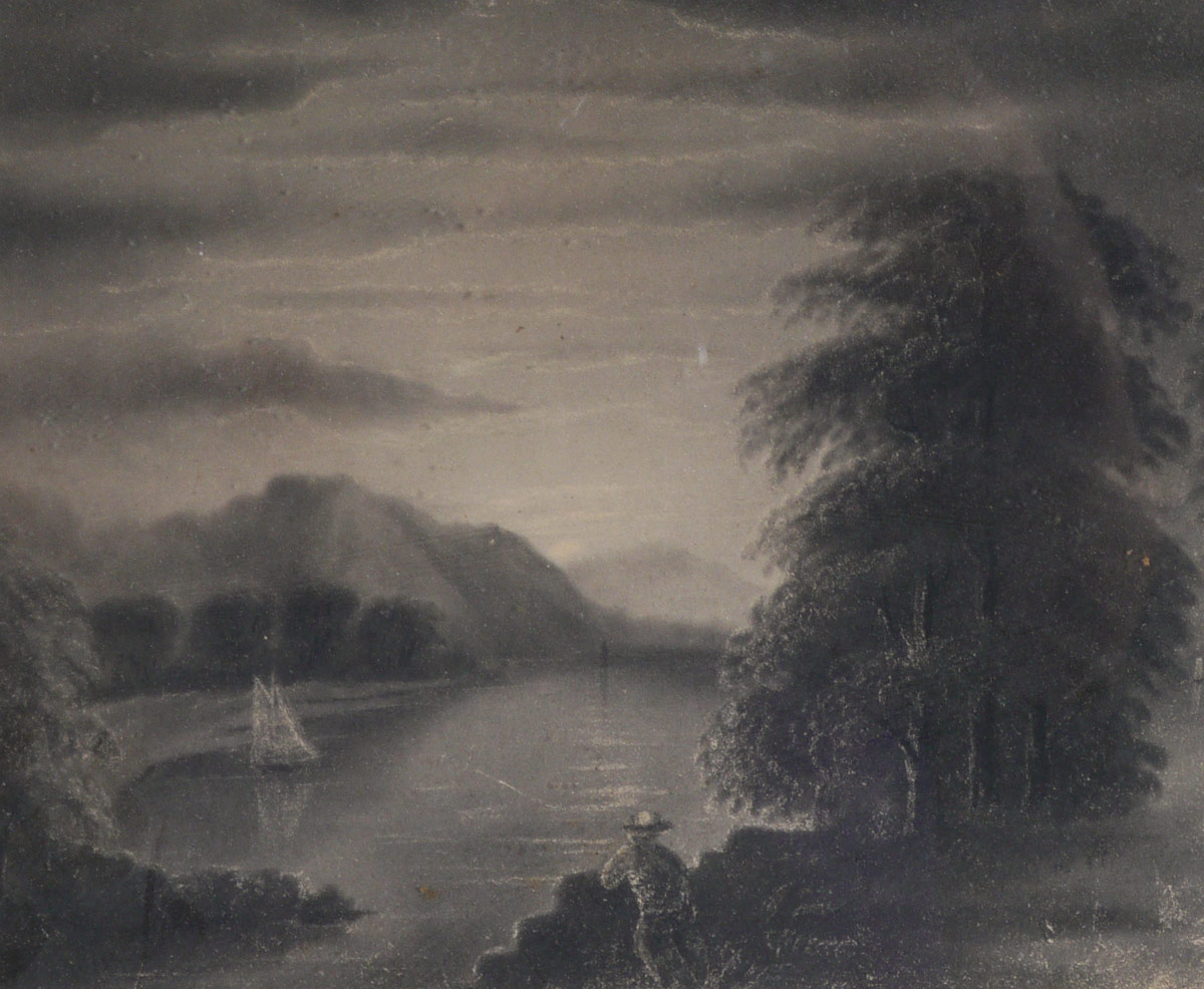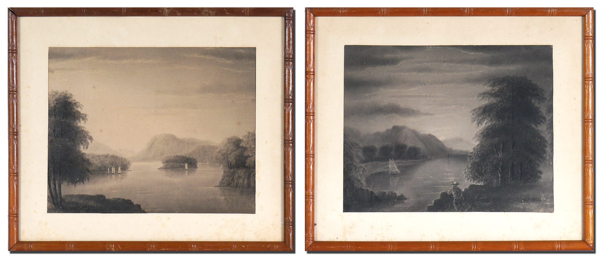 TWO HUDSON RIVER SCHOOL CHARCOAL PICTURES: Hudson River Scenes Depict Sailing Vessels in Lakeside or River Valleys, Sight size 8'' x 9 3/4'', no visible signature, encased in matching faux bamboo frames with wear 11 3/4'' x 13 3/4''. These come from a Dutchess County, New York Estate and are probably 19th Century.