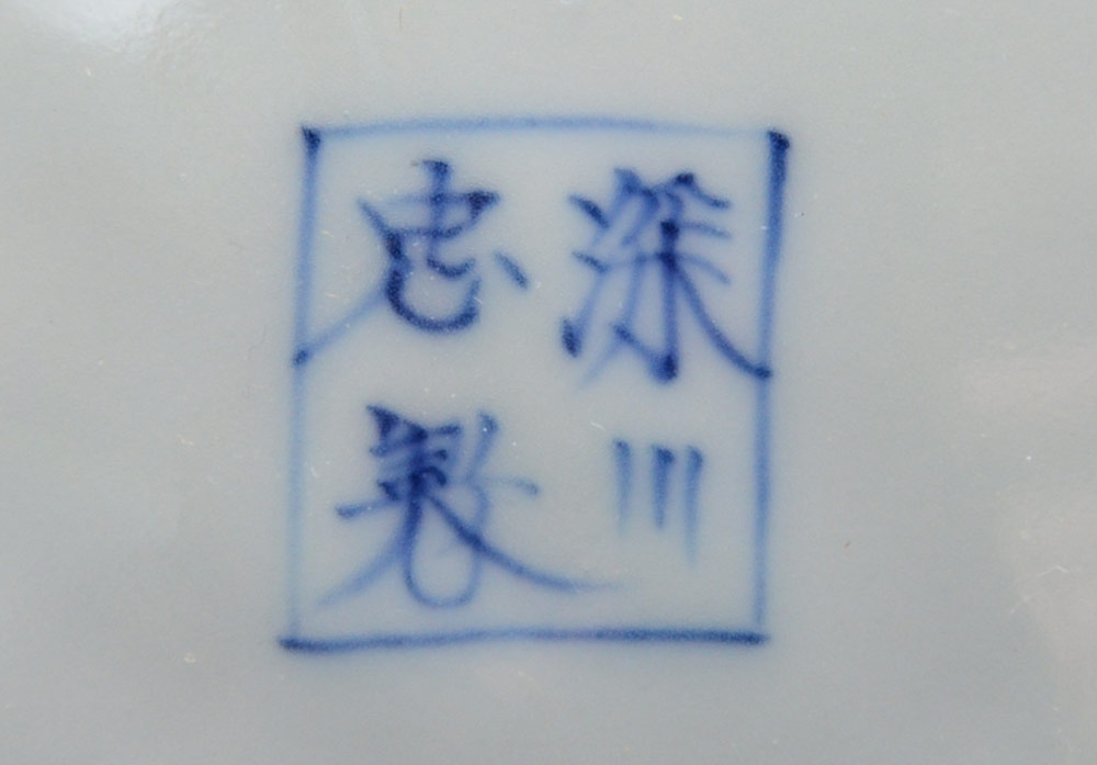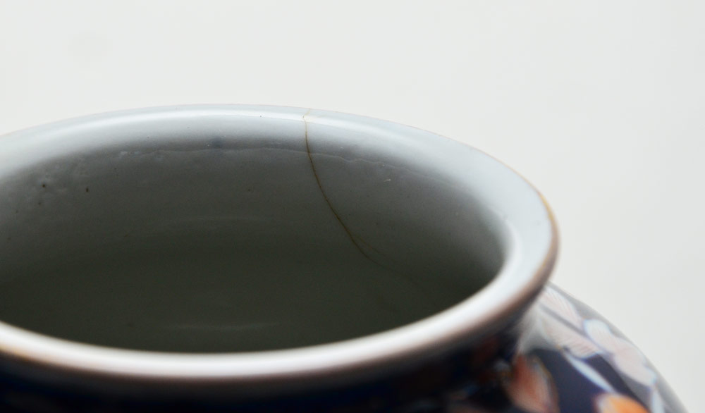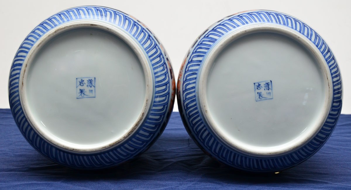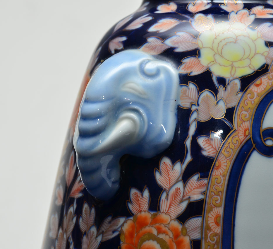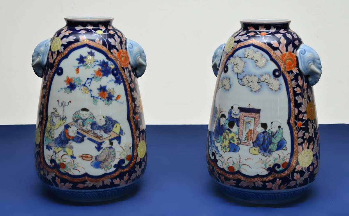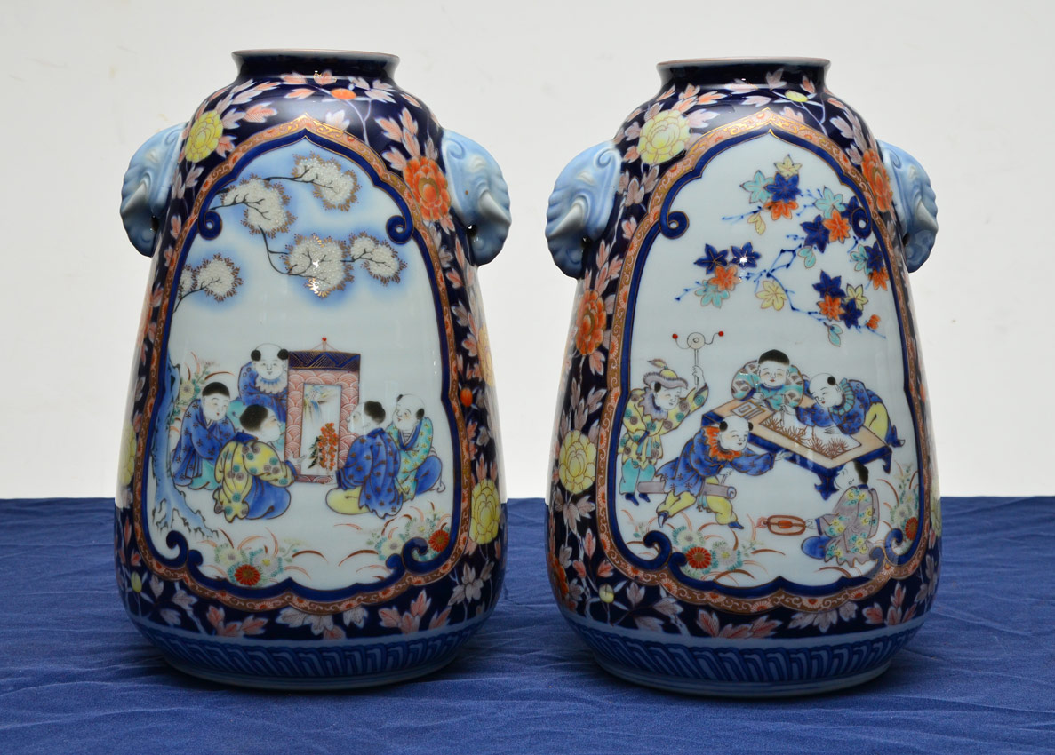 PAIR POLYCHROME ORIENTAL VASES: Ovoid form with imari colors, scenes of scholars on either side. Applied figural elephant head handles. Marked on base. Measures 12'' h. x 7 1/2''