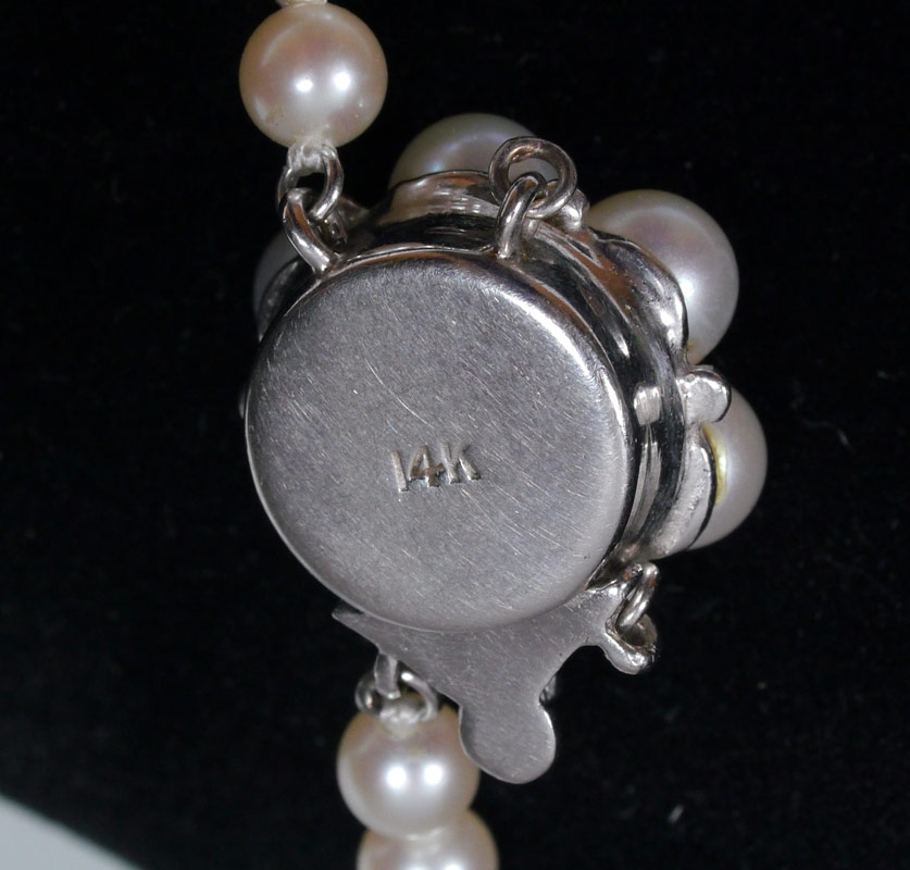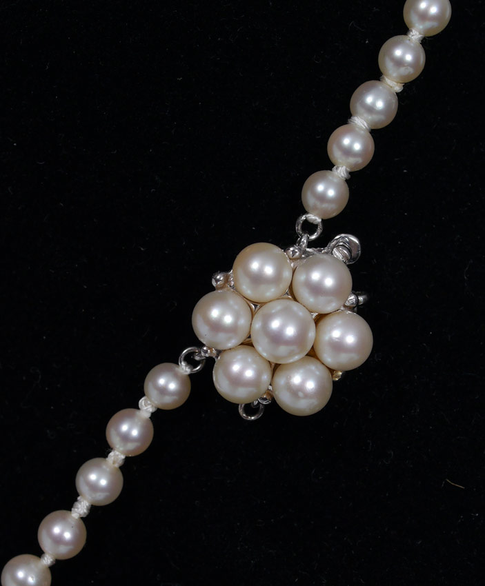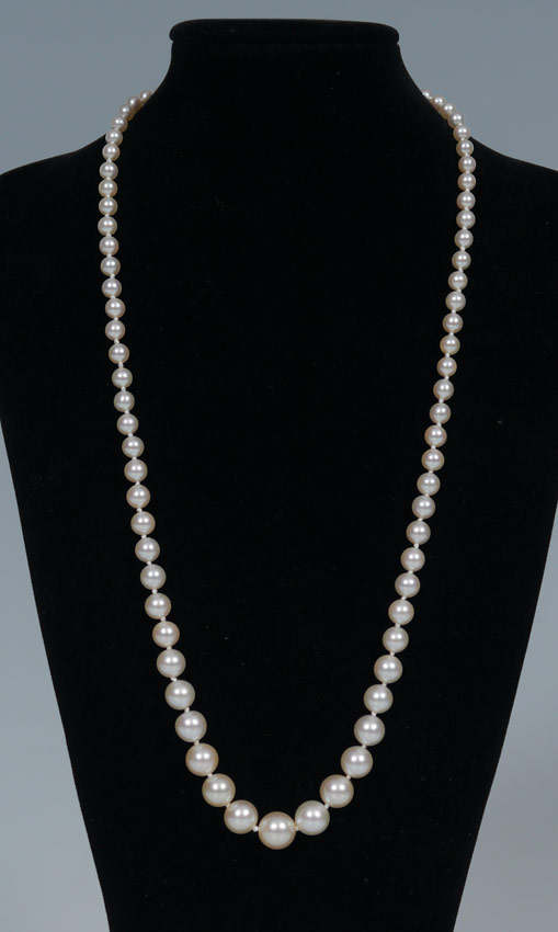 PEARL STRAND NECKLACE: A 21'' strand of graduated pearls, 9.75 mm-4mm. 14K white gold clasp has 5 pearls, approx. 5mm. Creamy white with slight rose overtones.