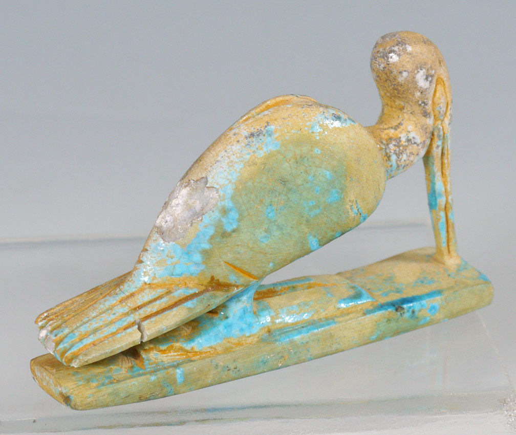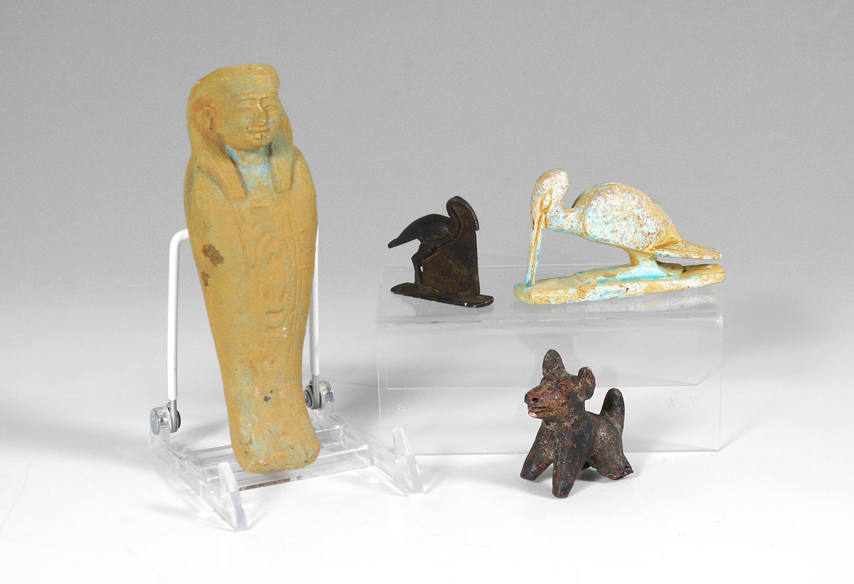 4 PIECE EGYPTIAN SMALL FIGURAL SCULPTURE LOT: 4 pieces total to include 1) Pottery figural dog, 1 7/8'' h.. 2) Metal figural ibis / stork, 1 5/8'' h. 3) Pottery figural stork, 3 1/4'' l. 4) Pottery sarcophagus, 5 3/4'' l. Actual age unknown.