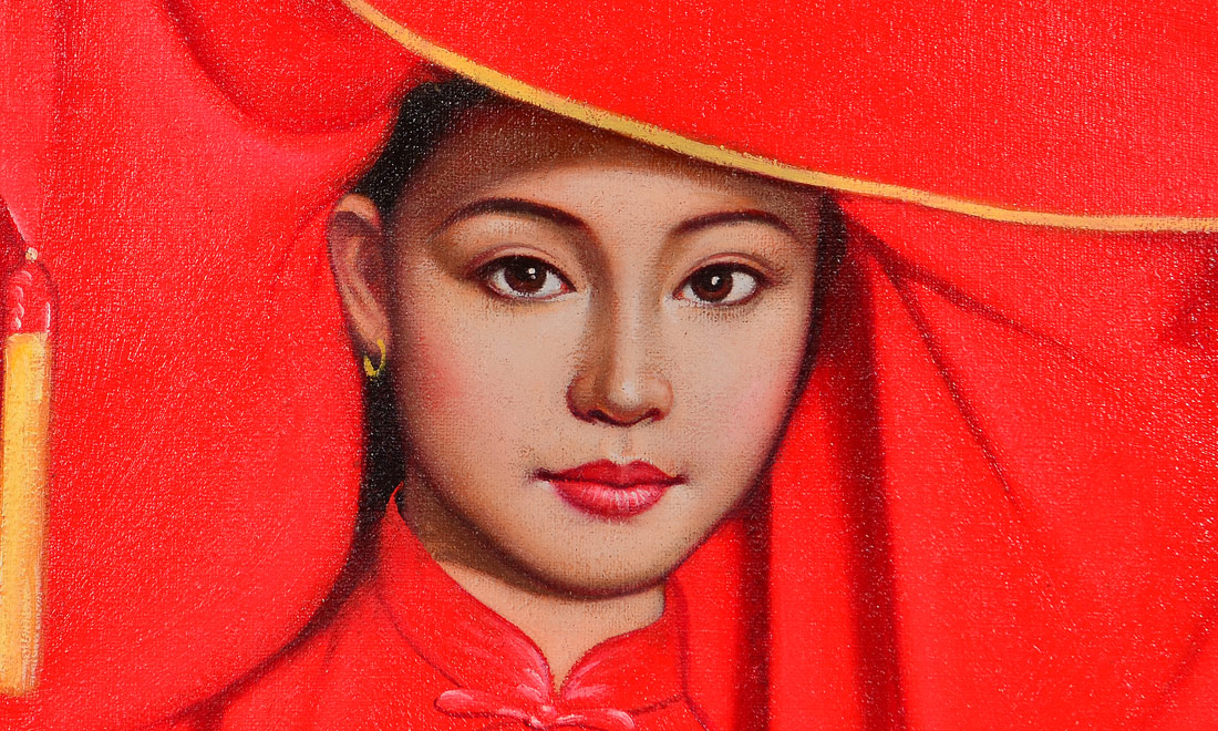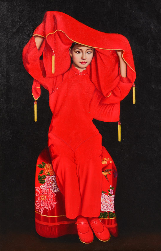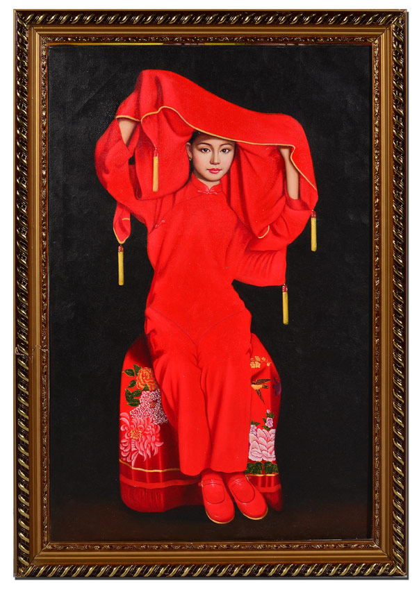 CONTEMPORARY CHINESE? PAINTING OF A YOUNG BEAUTY IN RED: Oil/Canvas, 35 1/2'' x 23 1/2'', illegibly markings to the canvas verso, gold frame with wear in need of repair 41'' x 28 1/2''.