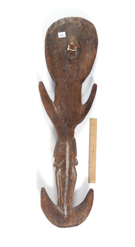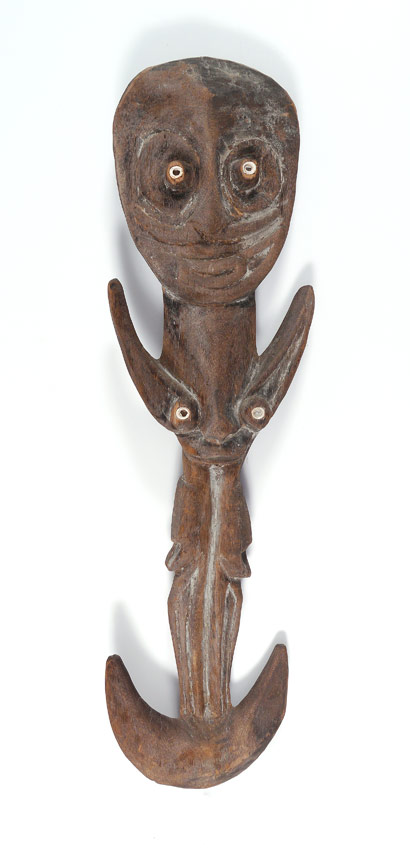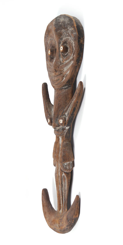 NEW GUINEA CARVED WOOD WALL HOOK STAND FROM THE SEPIK AREA: Carved with an Ovoid Head with Protruding Ridged Forehead, bulging eyes with inset cut cowry shells, relief carved nose, ridged features and mouth, and an elongated stylized body with outstretched wing arms; the ''elbows'' with inset cut cowry shells, terminating in an anchor form crescent hook foot, 36 1/2'' length.