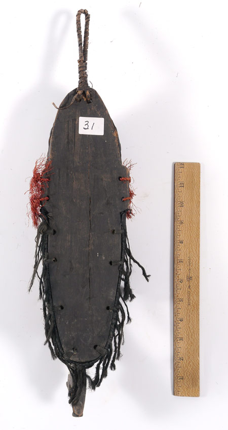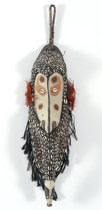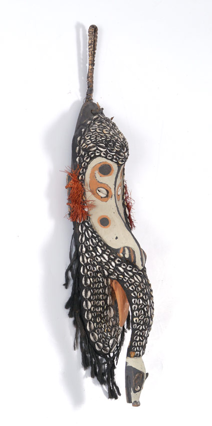NEW GUINEA PAINTED BLACK, OCHRE AND CREAM COWRY SHELL AND TEXTILE INSET CERAMIC ANIMAL MASK: Of elongated ovoid form, with incurvate facial features and flared nostrils, ovoid eyes inset with cowry shells, and a pendent curved beak issuing from the nose and cheeks, terminating in an animal's head with cowry shell eyes, the whole inset with cowry shells, the ears strung with sisal, and strung for hanging, labeled ''Mai mask, Yentchen'', 16 1/2'' h.