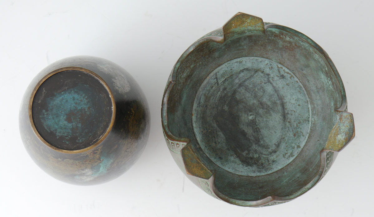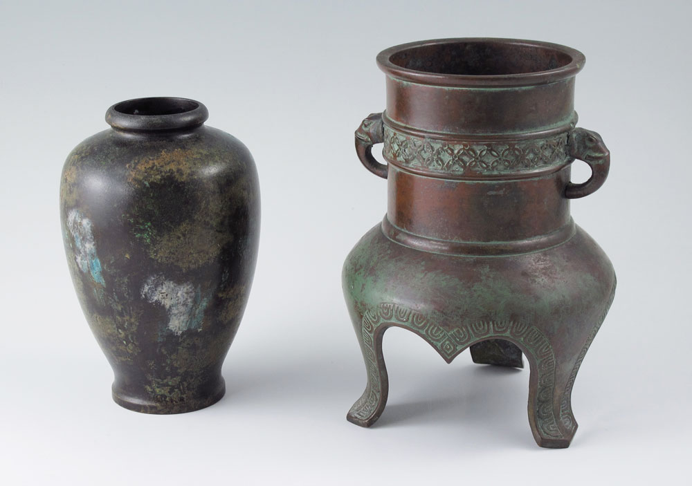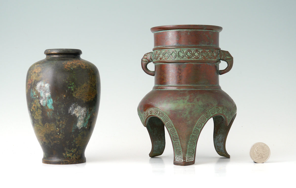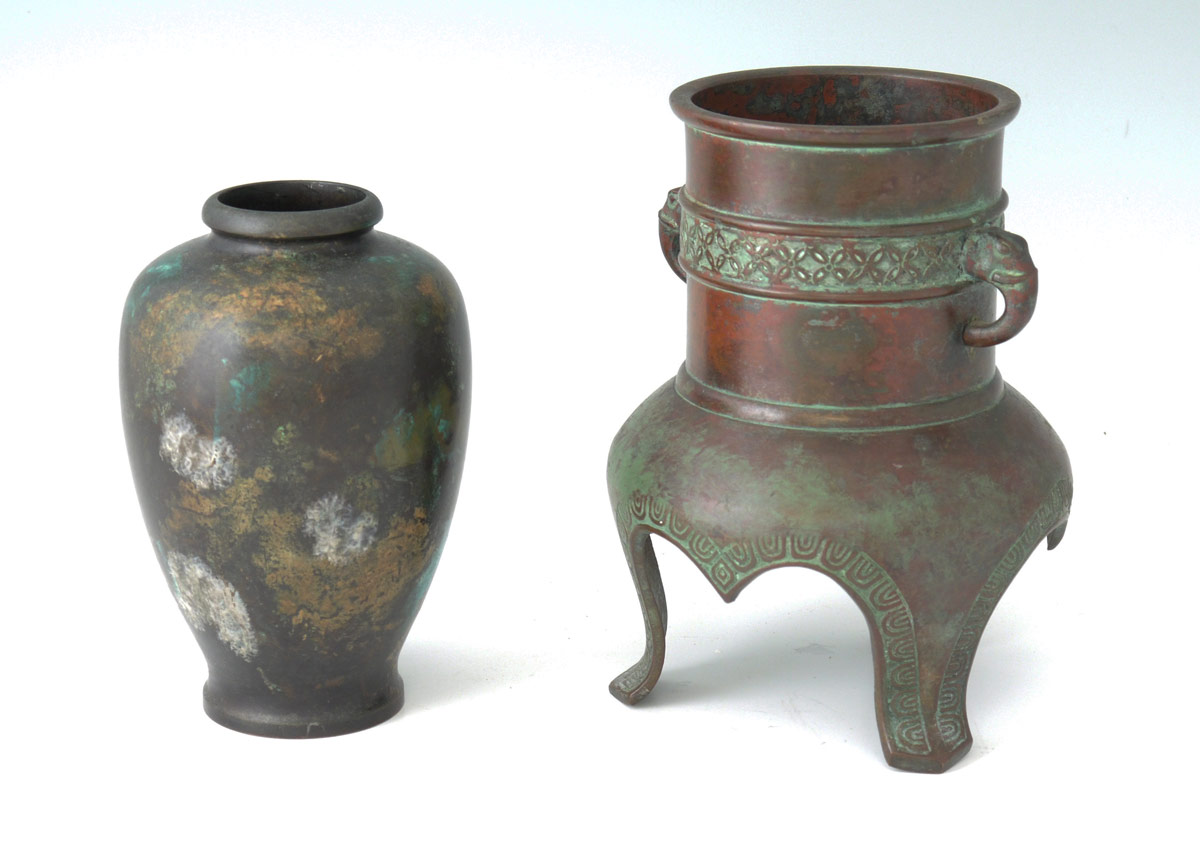 2 PIECE JAPANESE BRONZE VESSELS: To include 1) Bronze vessel with elephant form handles on 3 feet. Unmarked. 6 3/8'' x 4 1/2''. 2) Mottled glaze over copper jar, unmarked 5 3/8'' x 3 1/4''.