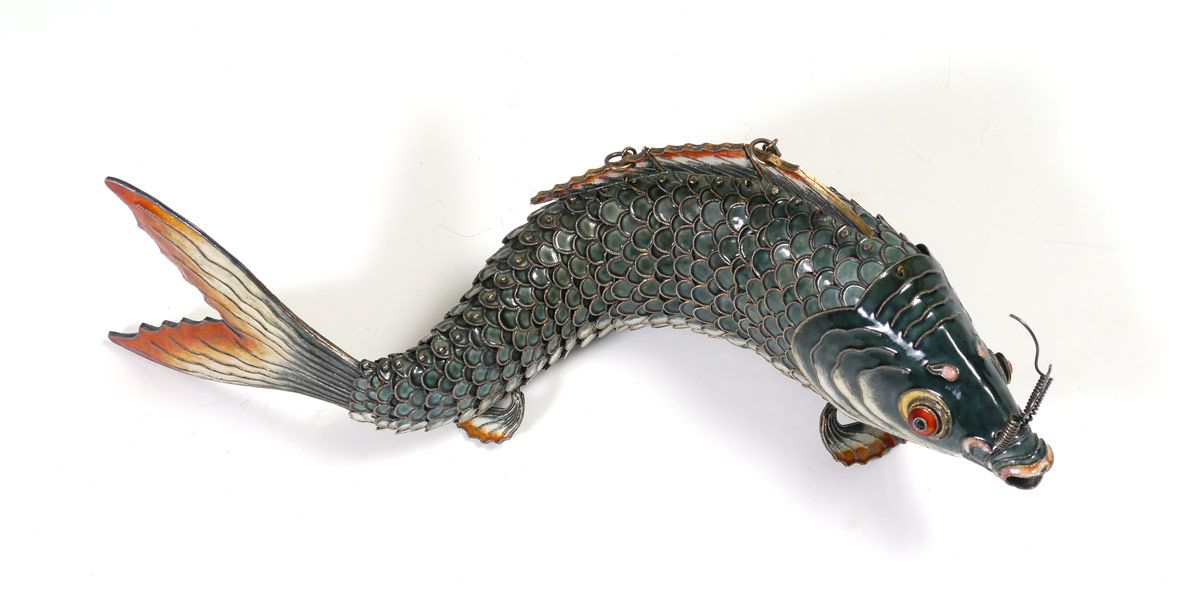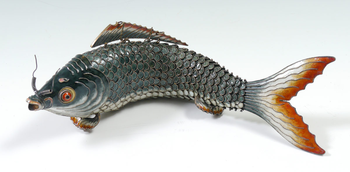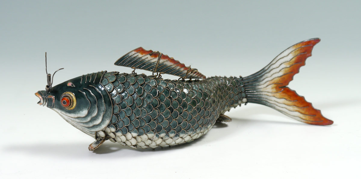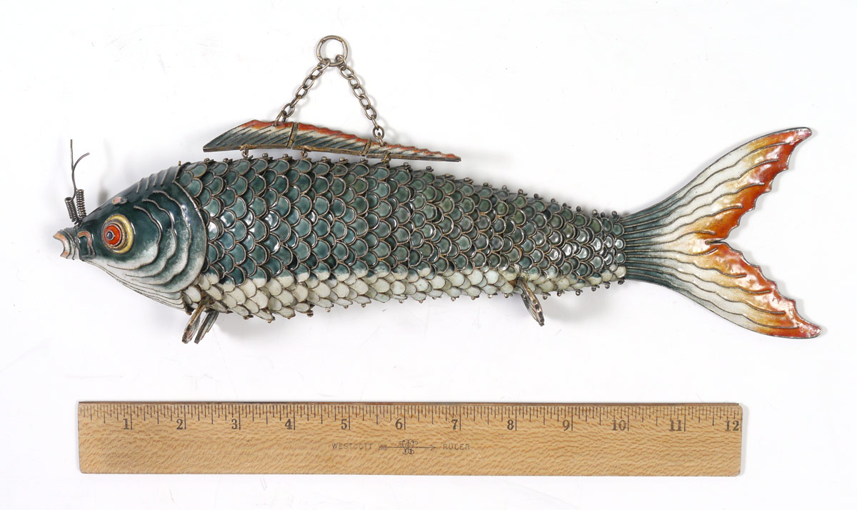 LARGE ARTICULATED ENAMELED FISH: Larger than most figural koi or carp with articulated body and fins. Overall 14'' long. Sold with a presentation box, 5 3/4'' h. x 11'' x 7 1/4''.