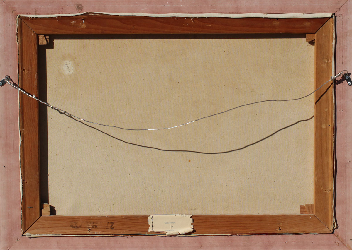 CONDITION: Abrasion in the lower mid margin, some minor stretcher bar wear.