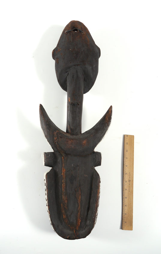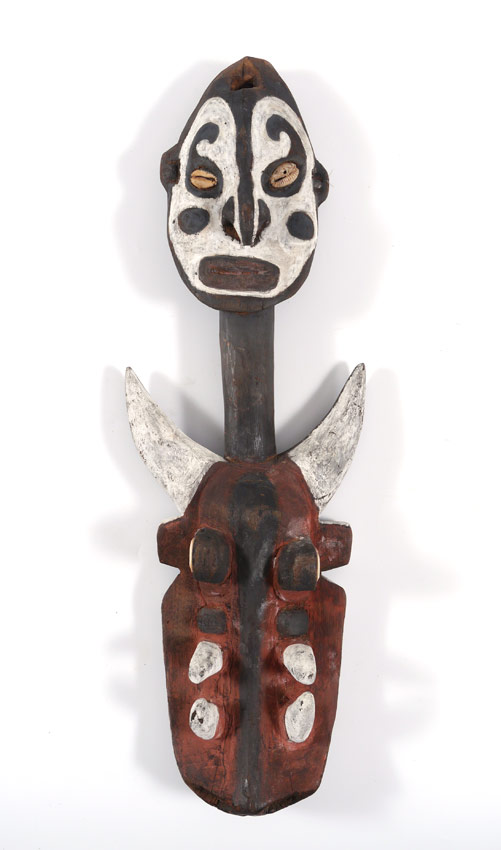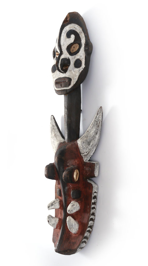 NEW GUINEA CARVED SEPIK STYLE SUSPENSION HOOK: In the Sepik River style, figural aboriginal head top, lower with figural crocodile head on the bias. Both with cowry shell eyes. Overall measures 28'' h. x 9 1/2'' x 3 3/4''