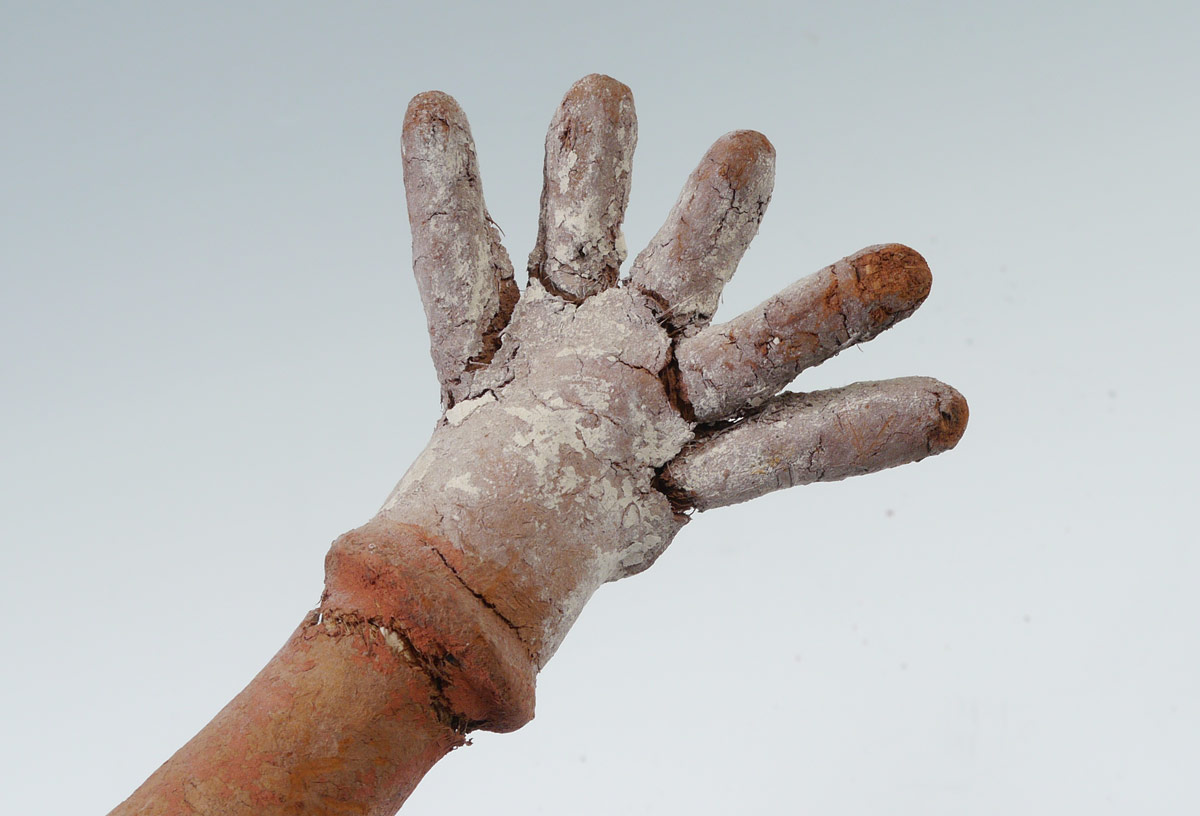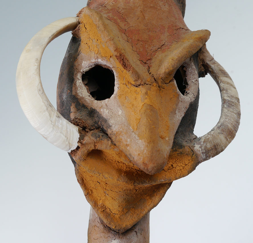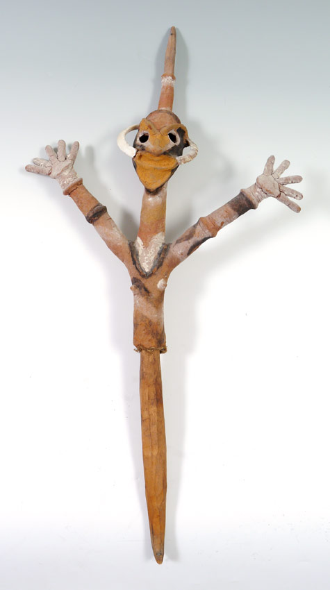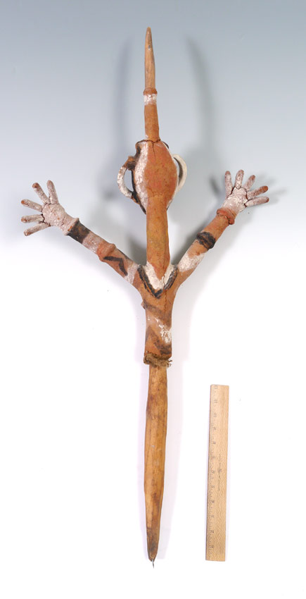 NEW GUINEA CARVED FIGURAL CEREMONIAL STAFF: Polychrome paint decorated figural man with outstretched arms. Base and finial carved to a point. Overall measures 37 1/2'' h. x 18 1/2'' x 4 3/4''.