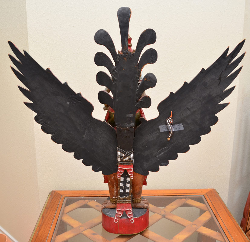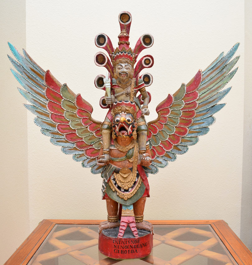 INDONESIAN CARVED FIGURE OF VISHNU RIDING GARUDA: Polychrome decorated figure of the Hindu god Vishnu riding atop Garuda. ''Inisnoe Menoenggang Geroeda'' written on base. Overall measures 28 1/2'' h. x 27'' x 7''.