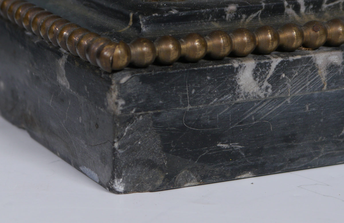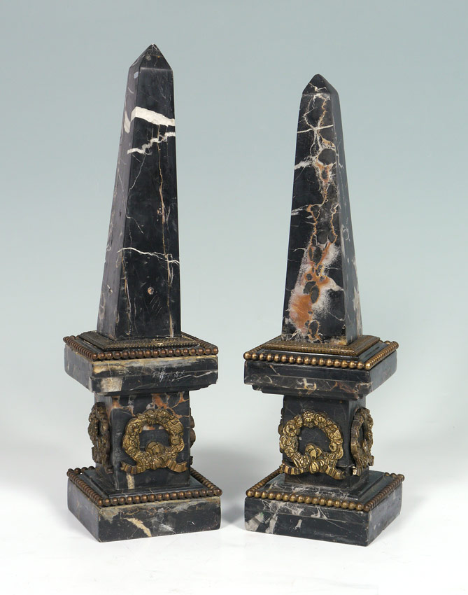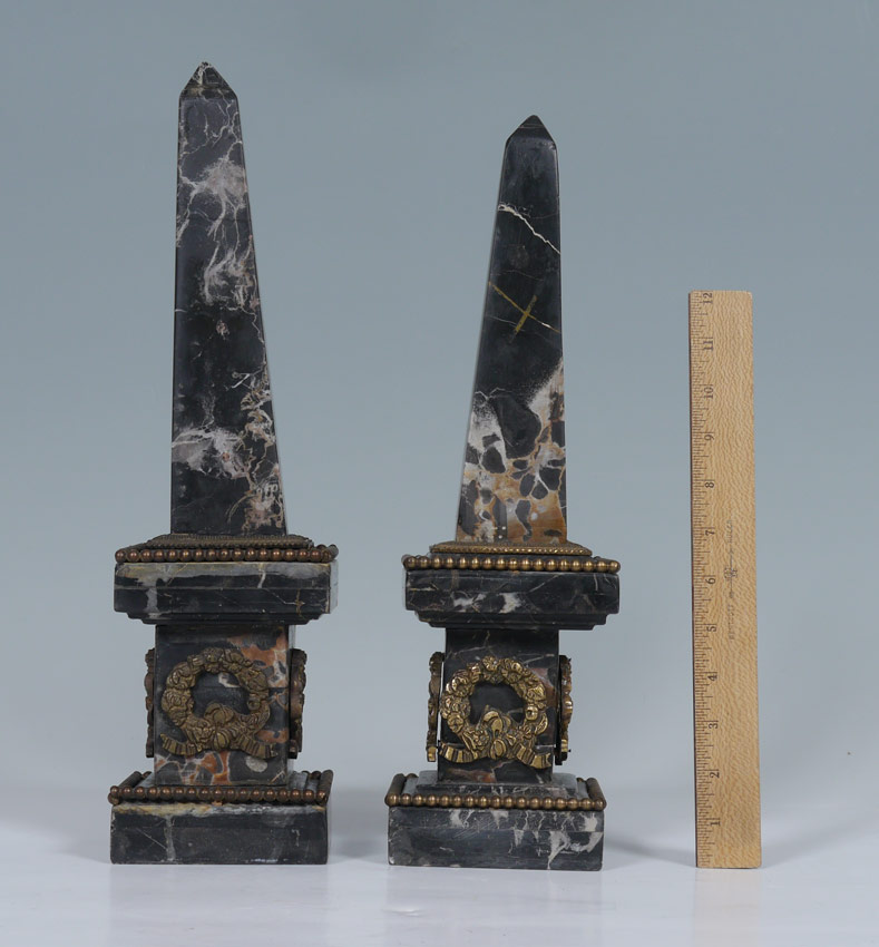 PAIR BLACK MARBLE OBELISK: One being slightly taller than the other. Applied cast metal decoration including wreaths. Taller measures 17'' h. x 4 1/2''.