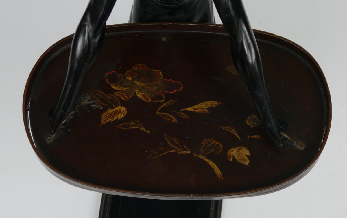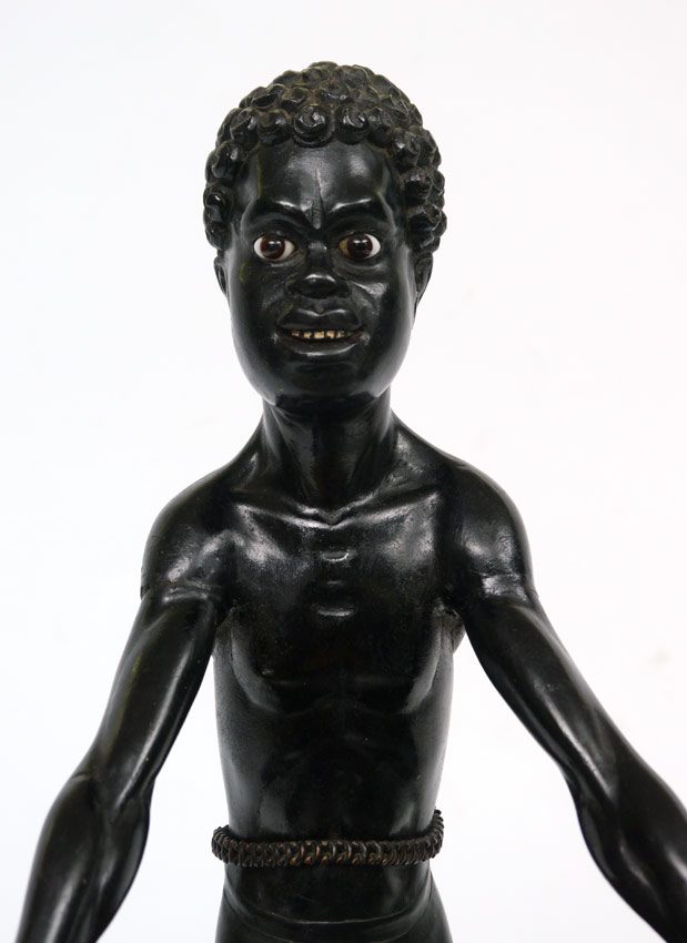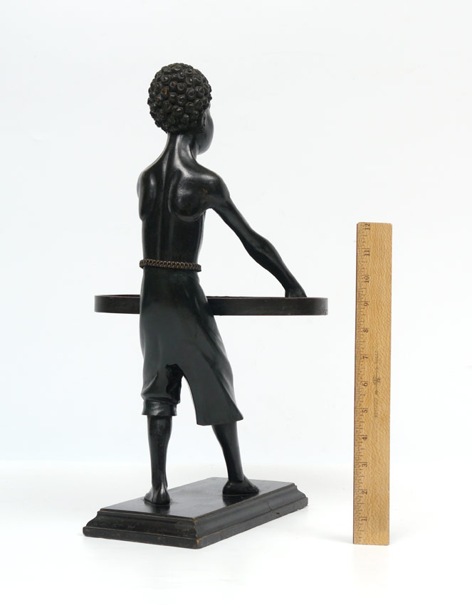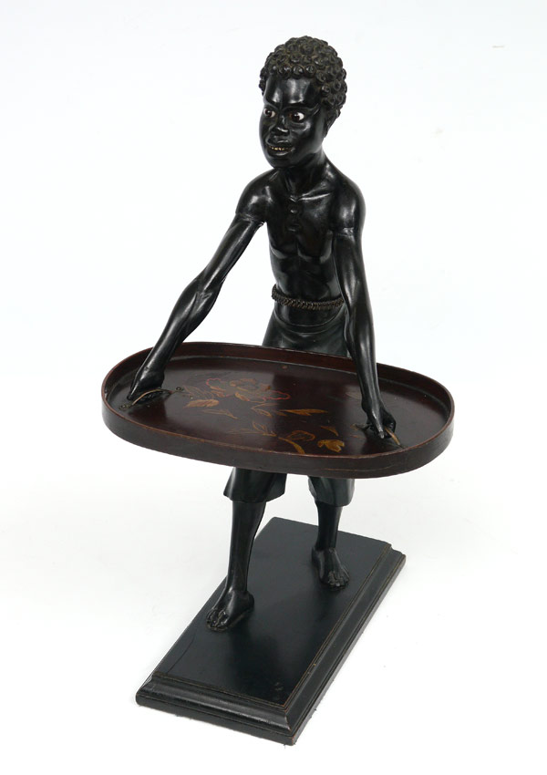 CARVED FIGURAL AFRICAN AMERICAN CARD TRAY: Carved figural of an African American boy with glass eyes carrying a hand painted tray. Overall measures 18 1/4'' h. x 10 1/4'' x 10 1/4''.
