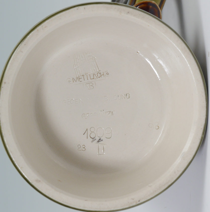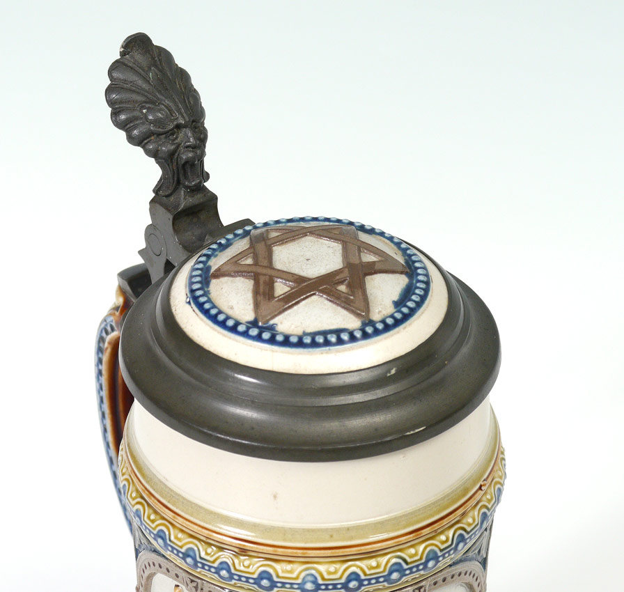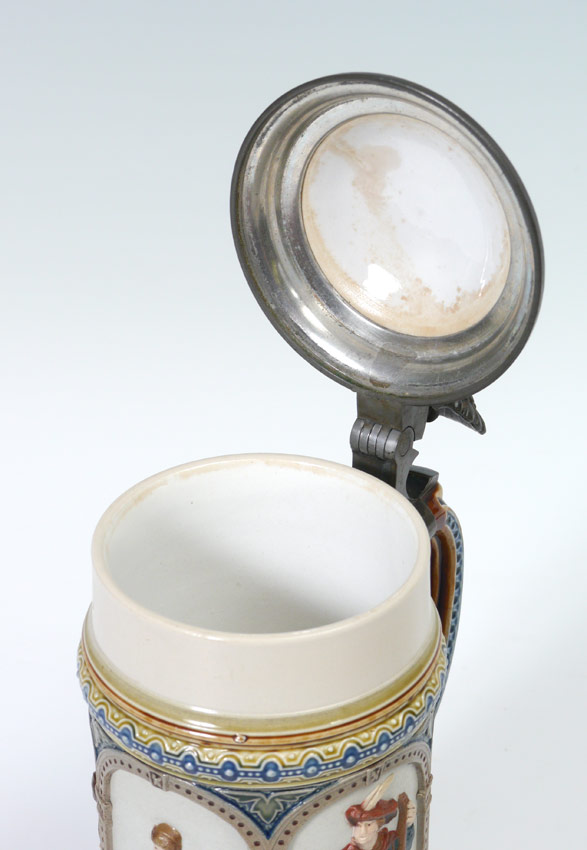 METTLACH #1809 GERMAN BEER STEIN: 1/2 liter stein with cavaliers and beer maidens. Pewter lid with inset star decoration. Impressed and incised marks on base. 8 3/4'' h. x 6''.