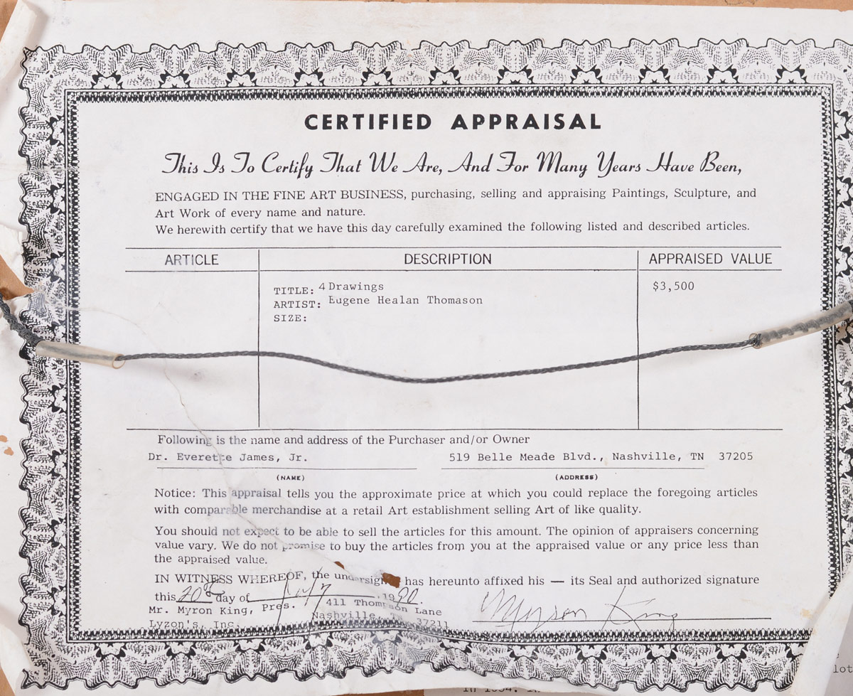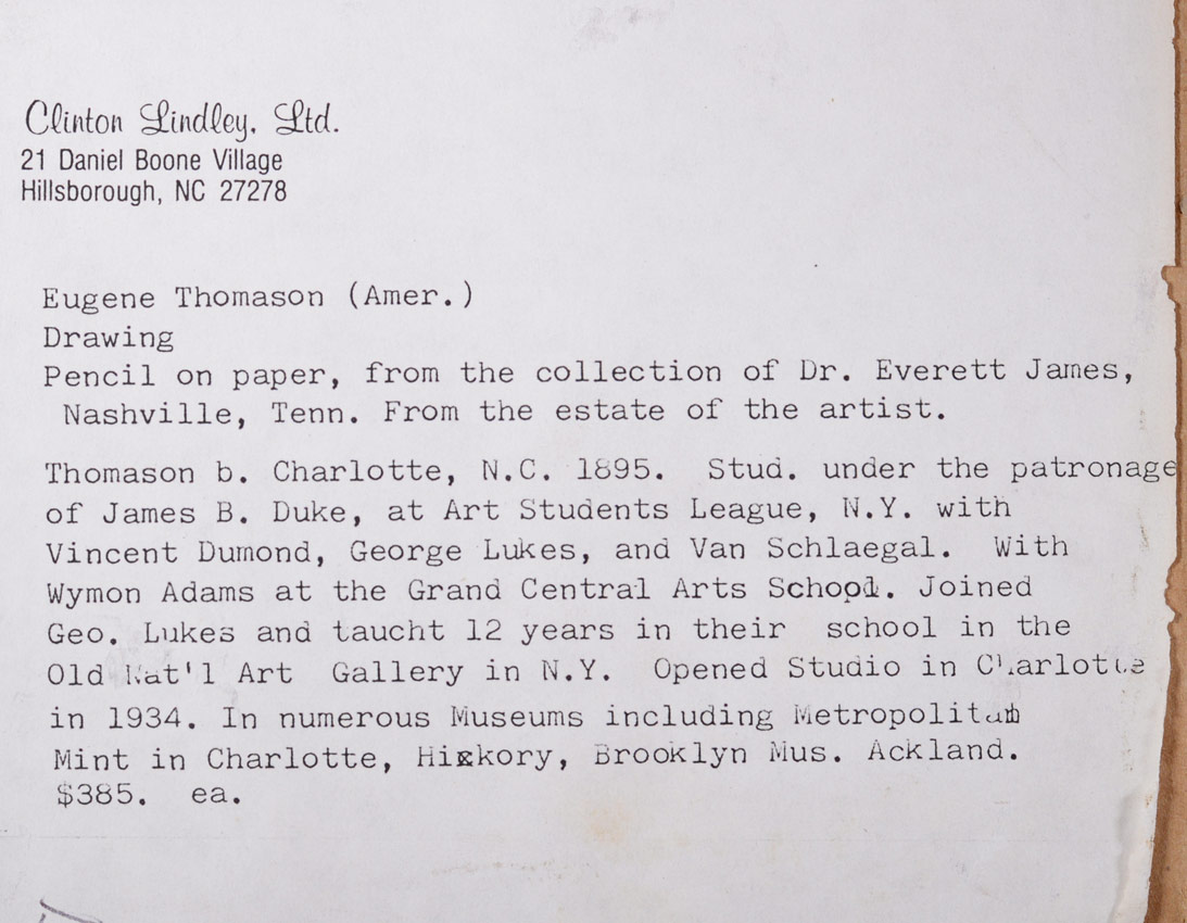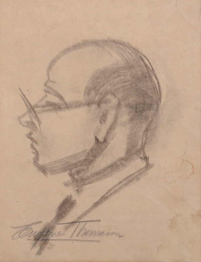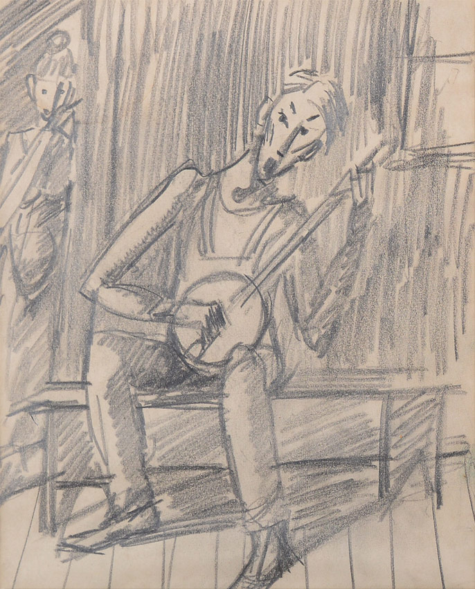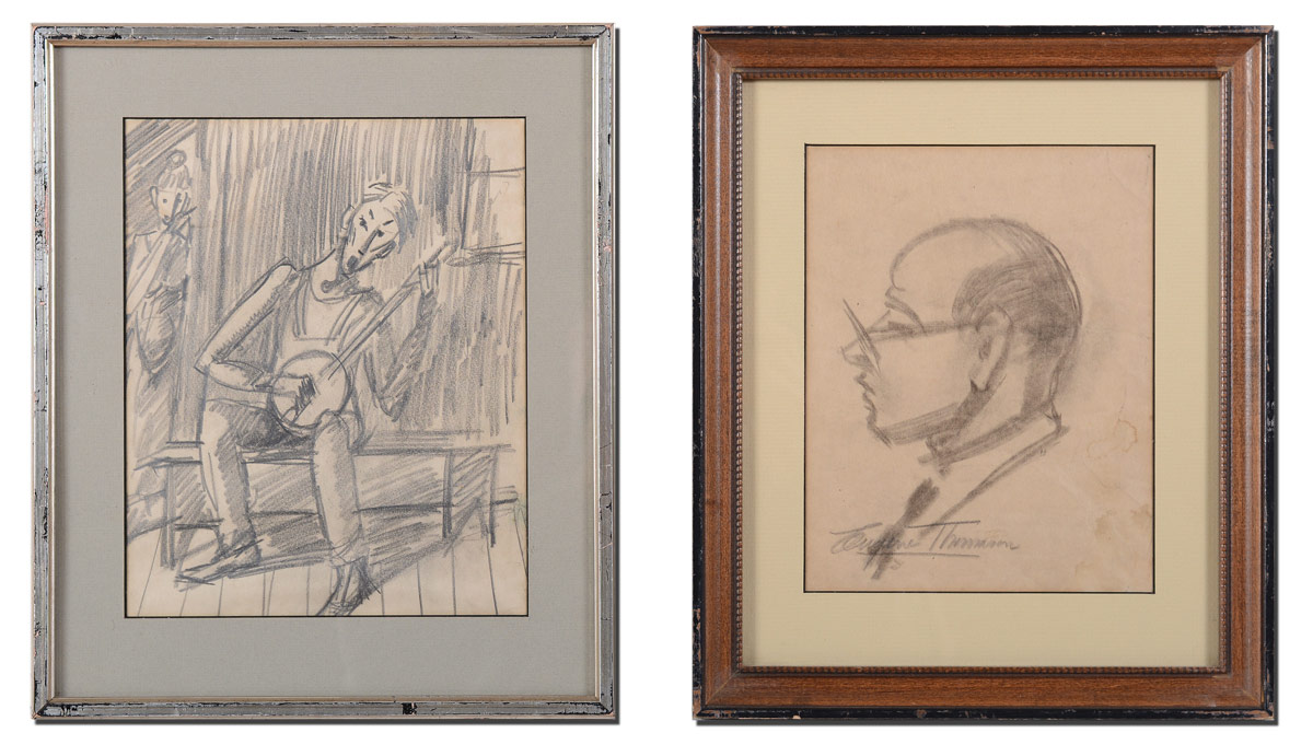 THOMASON, Eugene H., (American, 1895-1972): 2 Drawing to include; 1) Man Playing a Banjo, Sight size 9 3/4'' x 8'', worn silver gilt frame 14'' x 11 5/8''; 2) Portrait of a Spectacled Gentleman, Sight size 9'' x 6 3/4'', worn wood frame 13 3/4'' x 11 1/2'', silver gilt frame 14'' x 11 1/2''.