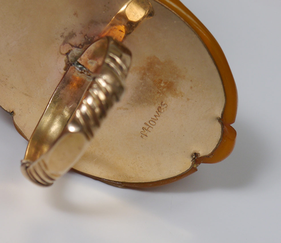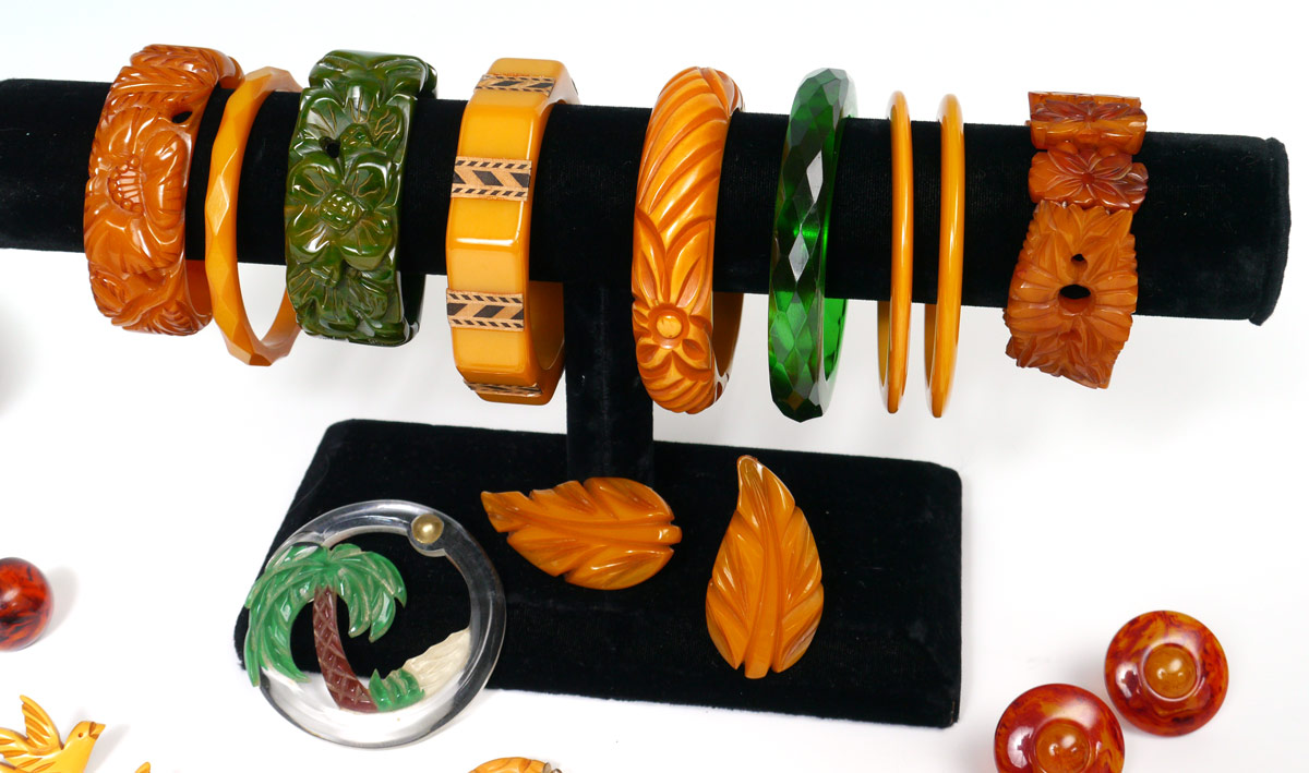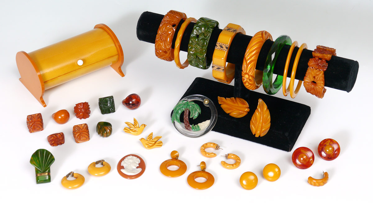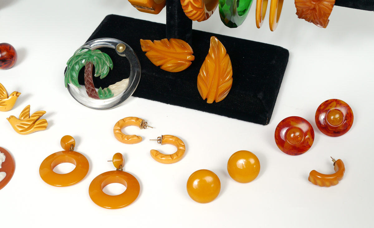ESTATE GROUP BUTTERSCOTCH & GREEN BAKELITE JEWELRY: Approx. 30 pieces to include 2 carved hinged bangle bracelets, wood inlay bangle, carved stretch bracelet, carved bangle, 3 smaller bangles, green Lucite bangle, carved Lucite palm tree pin, (2 5/8'' dia.), cameo, 6 pairs of earrings (2 are pierced), 8 rings, and a lift top tubular box (2 1/2'' x 5 1/2'').