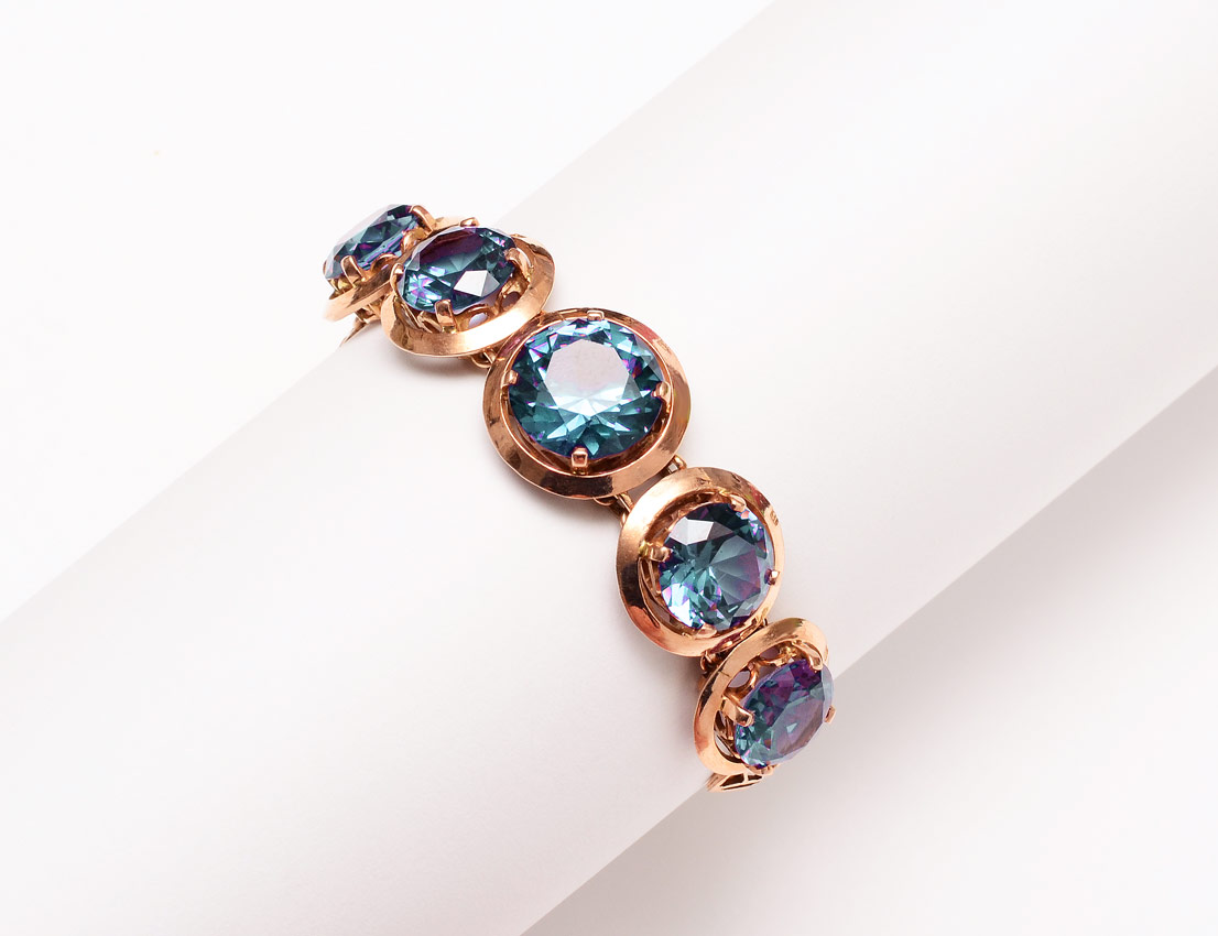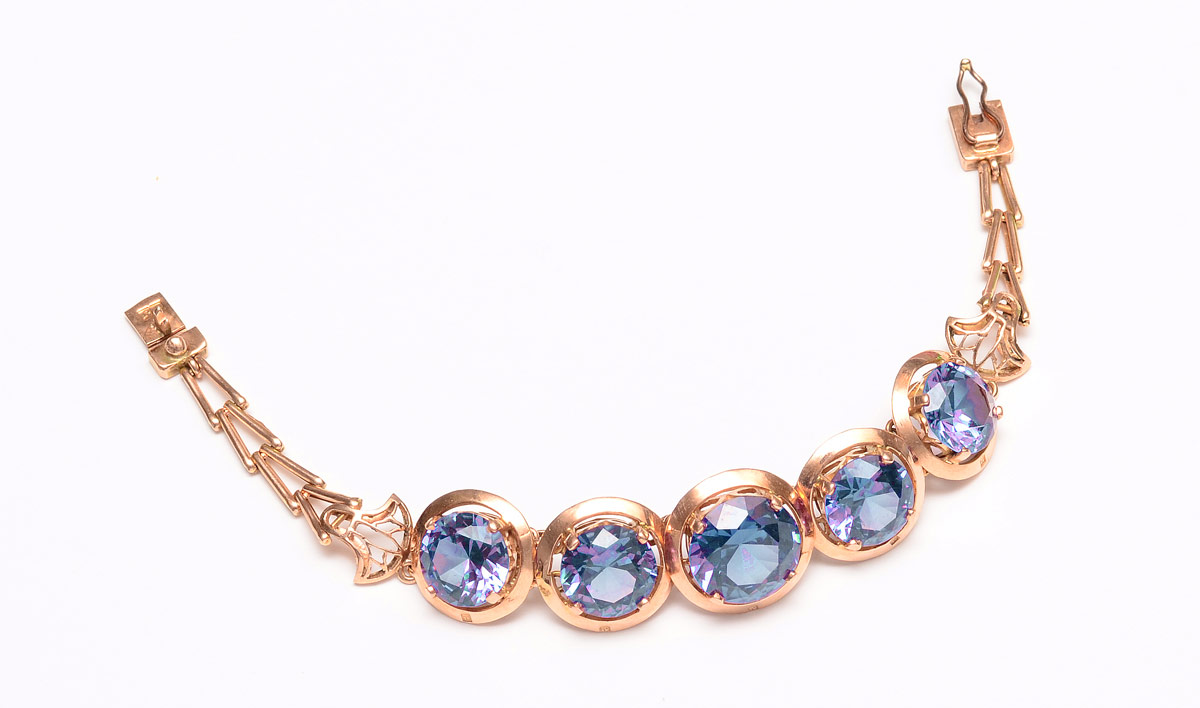 14K GOLD COLOR CHANGE SAPPHIRE BRACELET: 14K yellow gold bracelet contain five round 10.00 - 12.00 mm synthetic color-change sapphires. Mounting weight: 11.3 grams. approx. Locking closure with safety clasp. Length 6.5''.