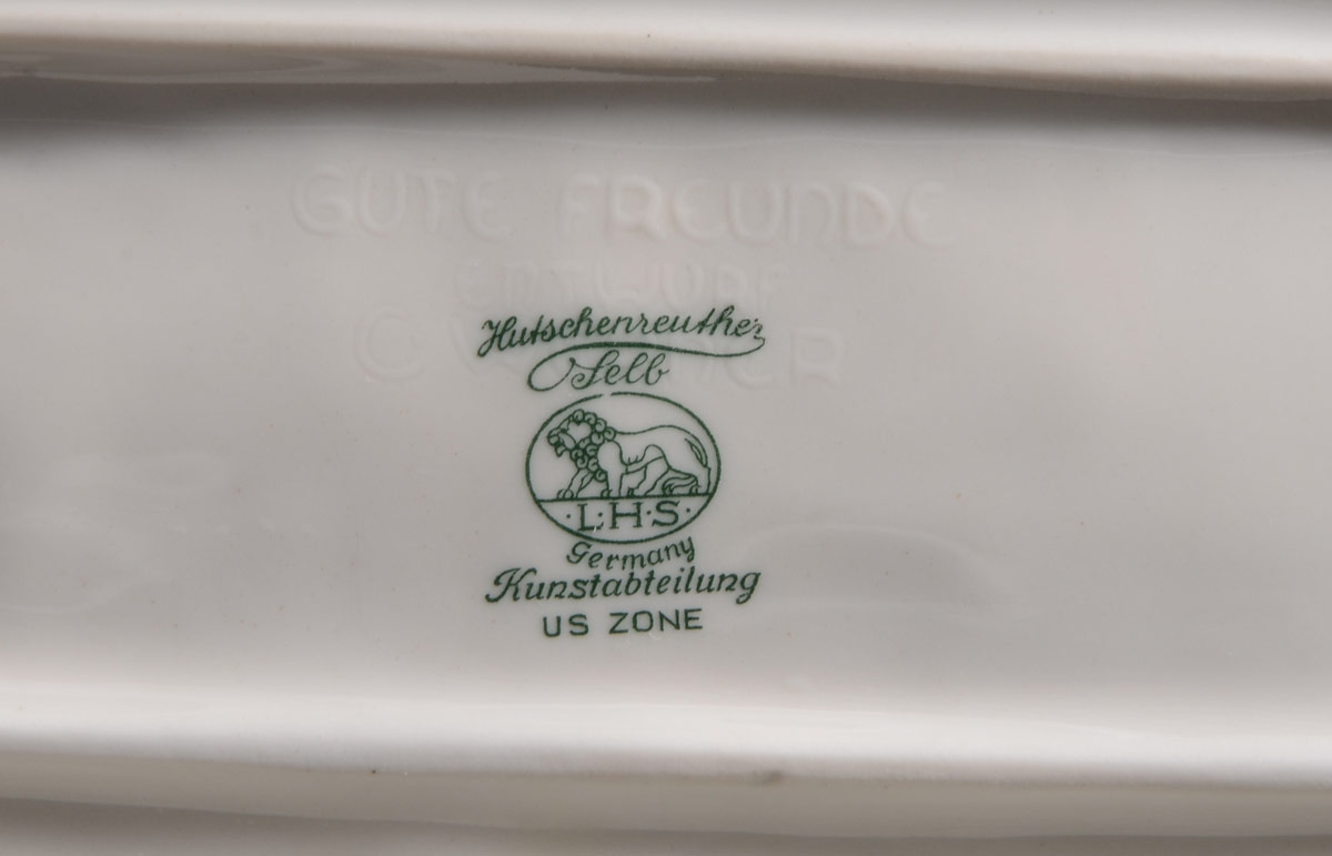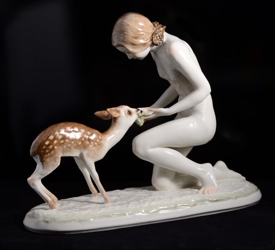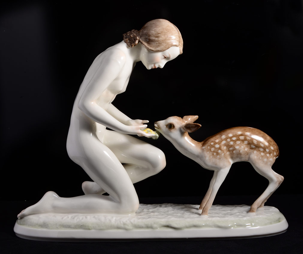 HUTSCHENREUTHER FIGURE OF NUDE MAIDEN WITH DEER: Figure of a nude kneeling maiden feeding a fawn, designed by Gute Freunde, marked on base. Overall measures 9 3/4'' h. x 12 1/2'' x 4 1/2''