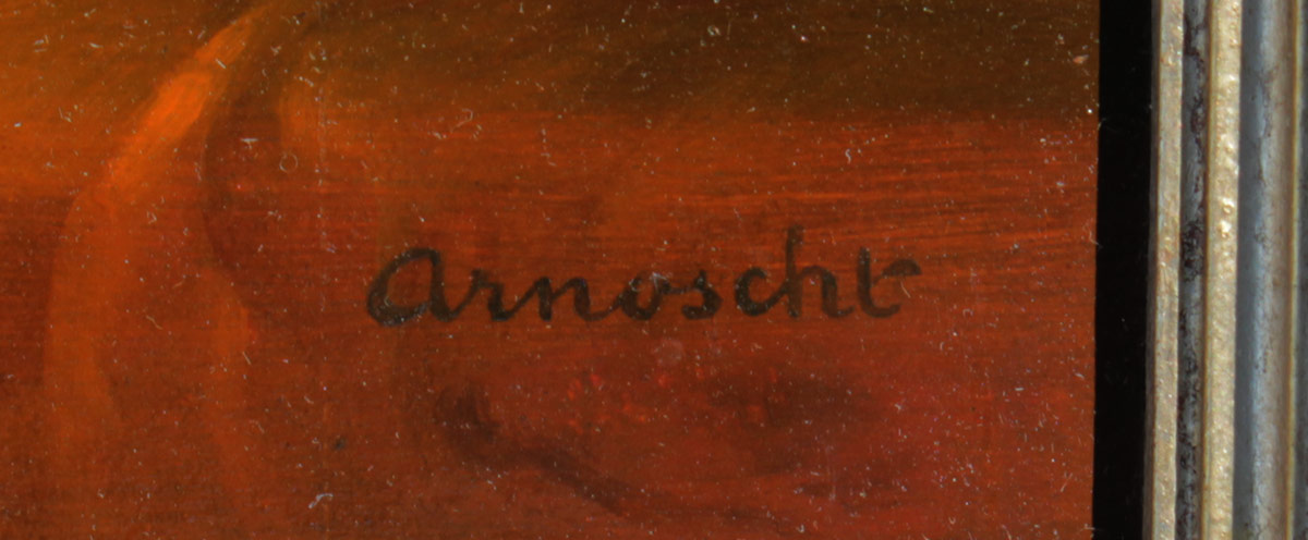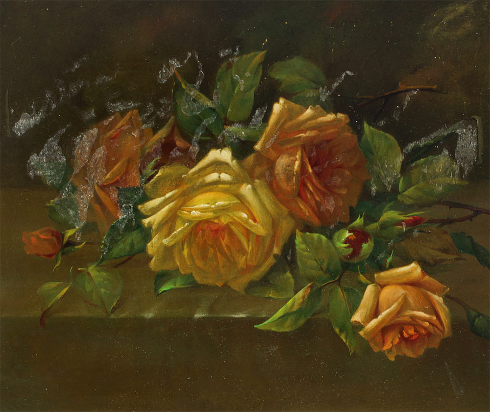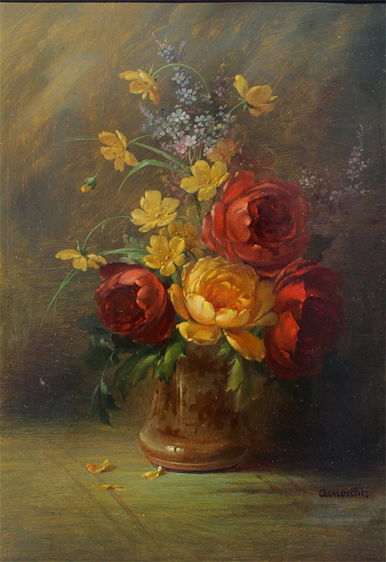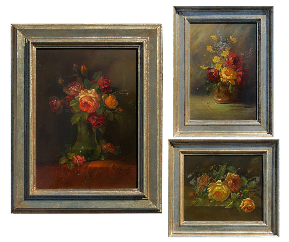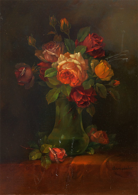 3 FLORAL STILL LIFE PAINTING LOT TO INCLUDE: 1) Still Life of Yellow Roses Laying on a Table, Oil/Canvasboard, 9 1/2'' x 11 3/4'', label affixed J.H. Guttmann, 148 East 57th Street, New York, 22 with a Murray Hill 8-3940 phone number, framed 13 1/2'' x 15''; 2) Floral Still Life of Red and Yellow Roses in a Pitcher, Oil/Canvasboard 13 1/2'' x 9 3/4'', signed Arnoscht in lower right corner, has a label affixed from J.H. Guttmann, framed 13 3/4'' x 17 1/2''; 3) Still Life of a Green Vase of Colored Roses, Oil/Canvas laid on Masonite, 18'' x 13'', signed lower right corner Arnoscht, label affixed from J.H. Guttmann, framed 24 1/4'' x 19 1/2''.