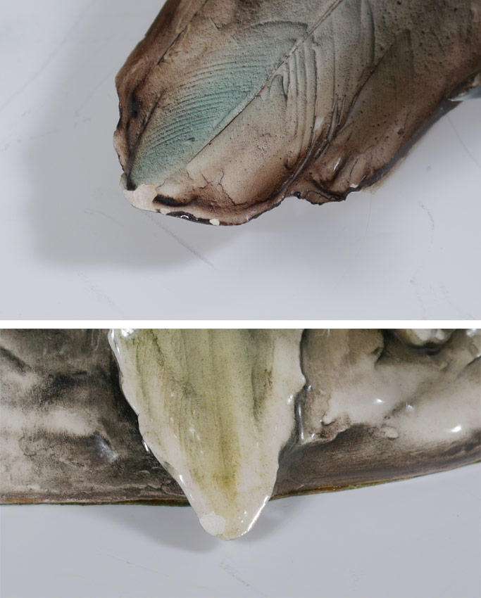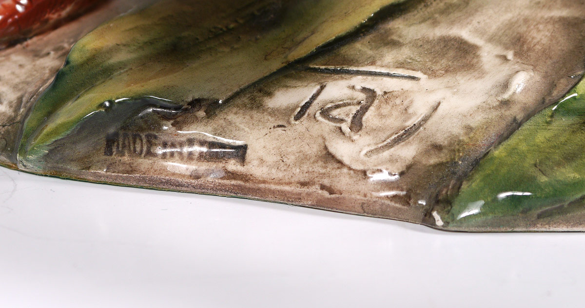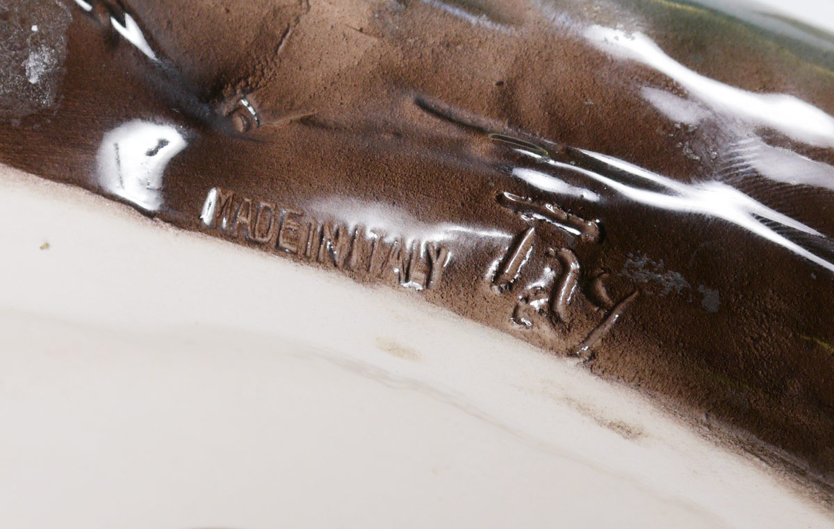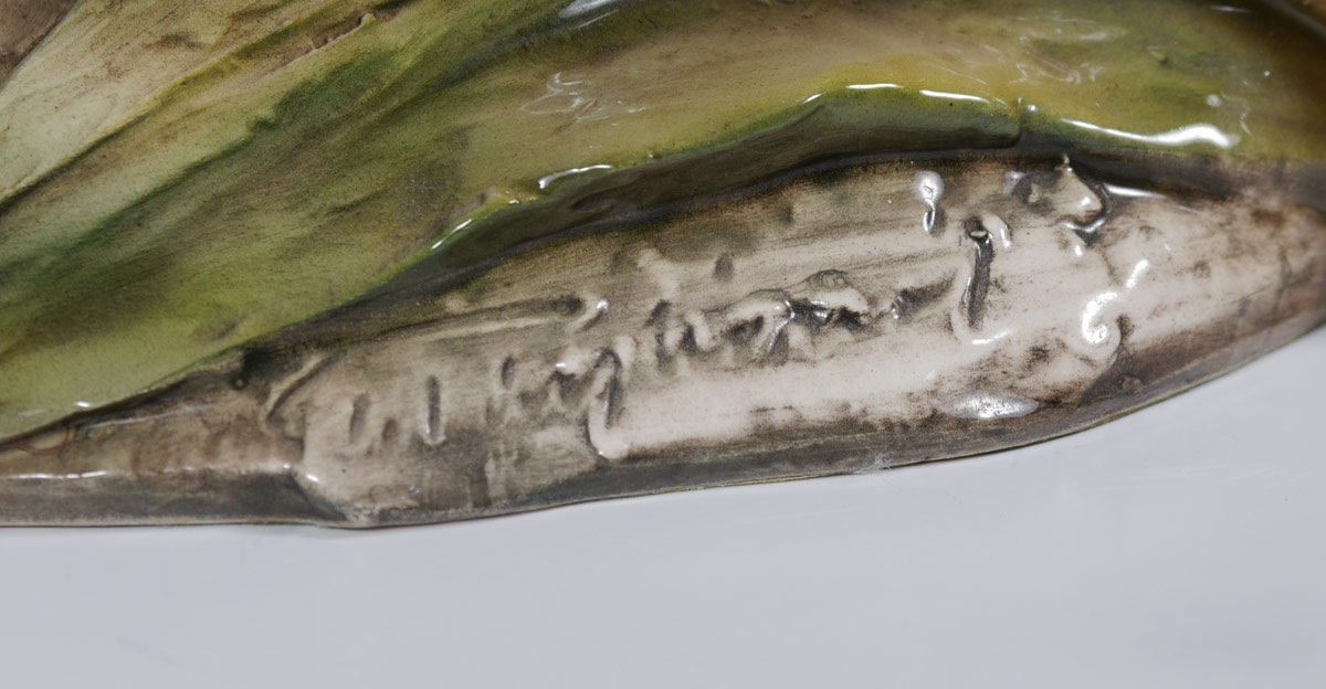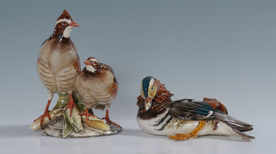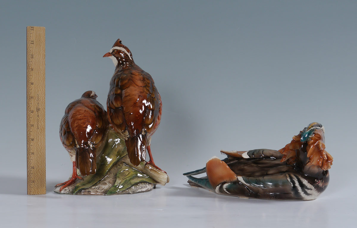 2 TAY ITALIAN CERAMIC BIRD FIGURINES: Realistic coloration in majolica glaze. 2 piece group to include 1) Pair of quail standing on corn. Illegibly signed. Overall measures 11 1/2'' h. x 9 1/2'' x 9''. 2) Reclining duck with brilliant plumage. 5 1/2'' h. x 12 1/2'' x 7 1/4''. Both are impressed ''Tay''.