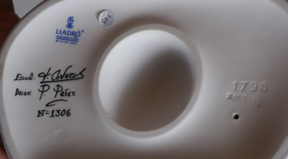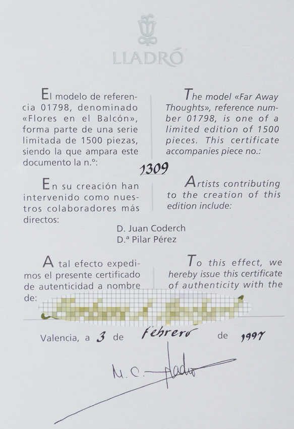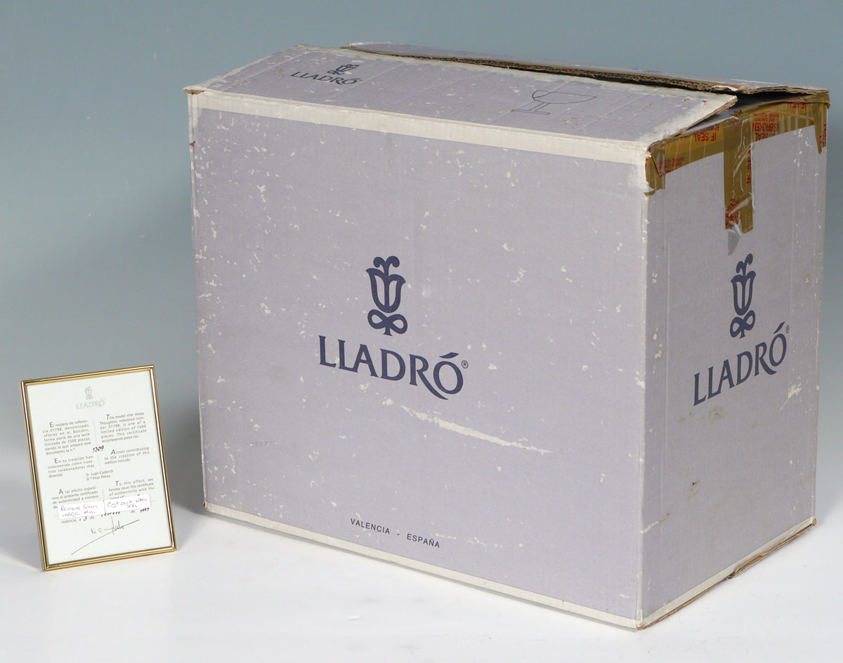 LLADRO PORCELAIN FIGURE ''FAR AWAY THOUGHTS'': #1798, Limited Edition #1309/1500, Joan Coderch sculptor, issued 1995 retired 1997, approx. 15 3/4'' x 13 3/4''.