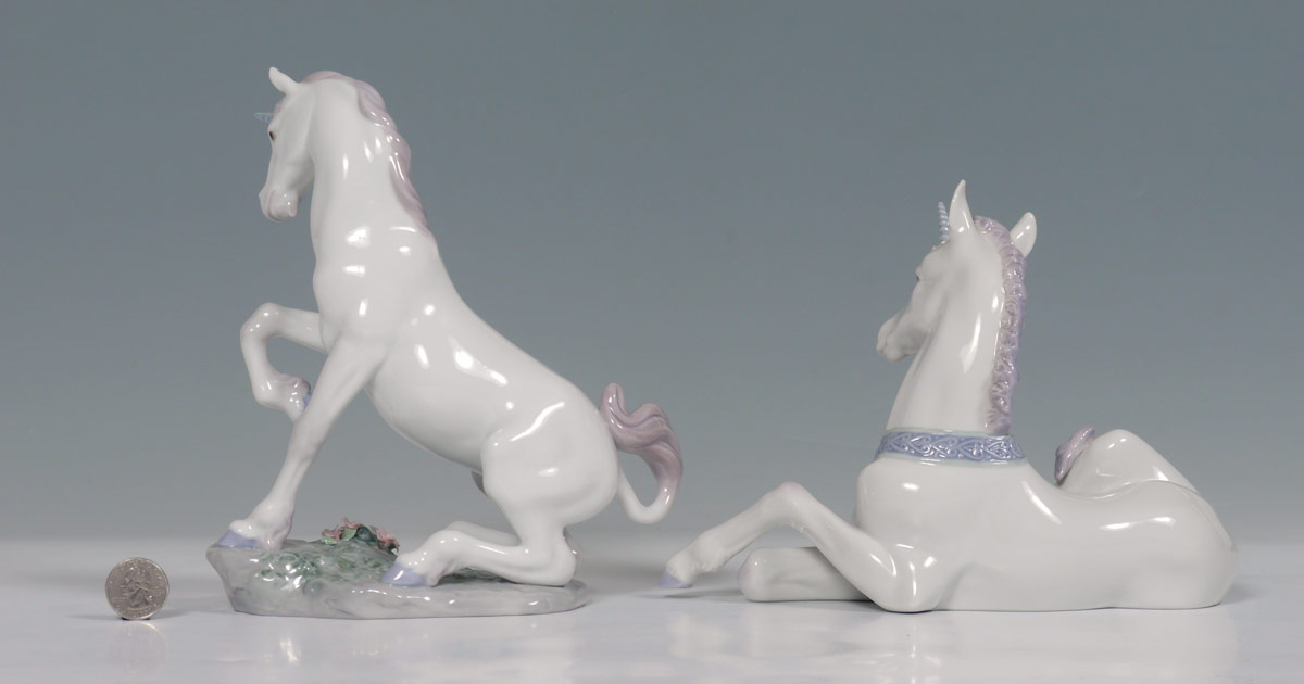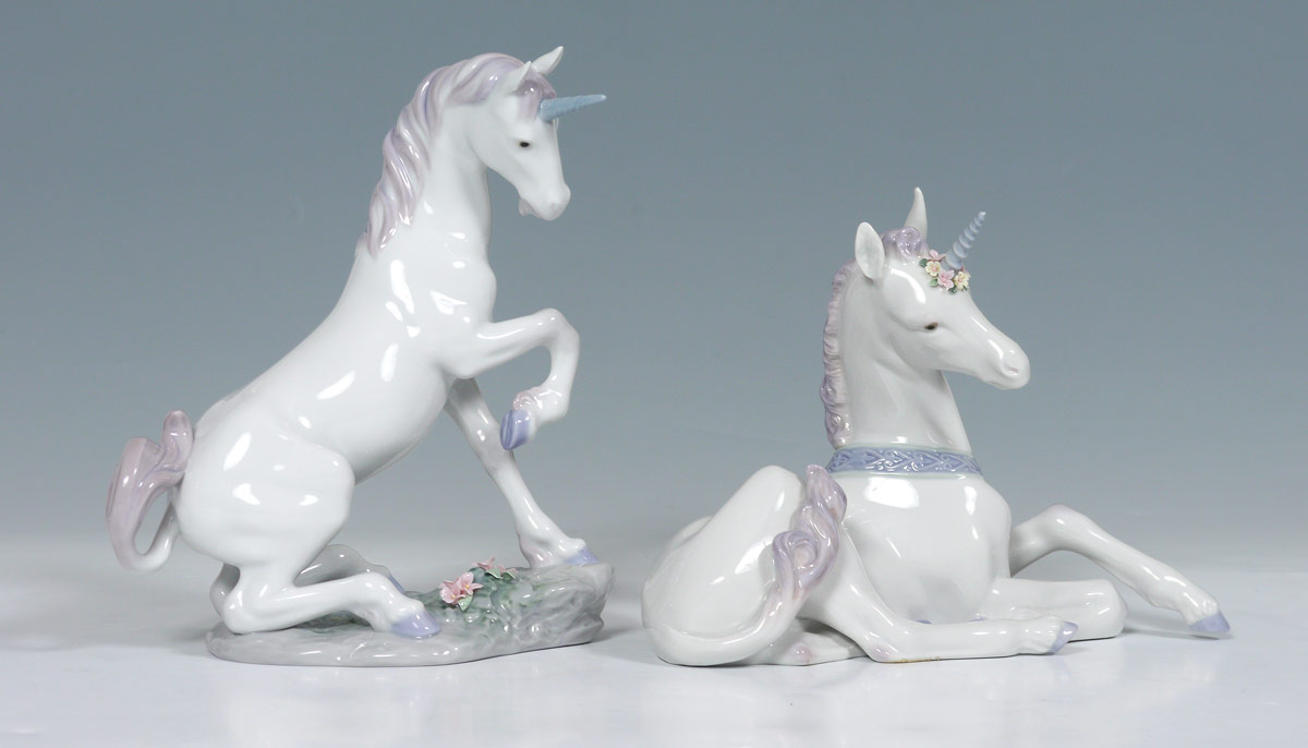 LLADRO PORCELAIN FIGURES: 1) MAGICAL UNICORN #7697, 3rd and last sculpture of the ''Enchanted Forest Collection'', Joan Coderch sculptor, issued 2003 retired 2004, approx. 8 3/4'' x 7''. 2) LITTLE UNICORN #5826, Jose Luis Alvarez sculptor, issued 1991 retired 1997, approx. 6 1/4'' x 9''.