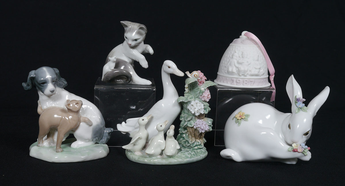 LLADRO PORCELAIN FIGURES: 1) CAT AND MOUSE #5236, Juan Huerta sculptor, issued 1984, 3 1/4'' x 2 3/4''. 2) 1987 CHRISTMAS BELL #5458, Jose Roig sculptor, issued and retired 1987, 2 3/4'' plus ribbon. 3) PREENING BUNNY WITH FLOWERS #6099, Juan Huerta sculptor, issued 1994 retired 1997, 4''. 4) HOW DO YOU DO!! #1439, Juan Huerta sculptor, issued 1983, 4 3/4'' x 4''. Sold as a lot with 5) NAO DOG AND CAT IN HARMONY #1048, Regino Torrijos sculptor, issued 1992, 4 1/4''.