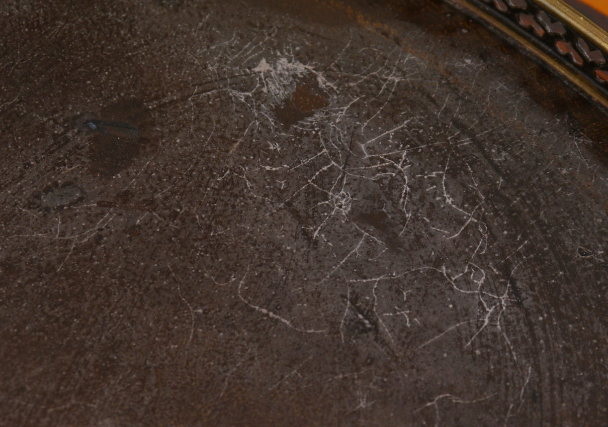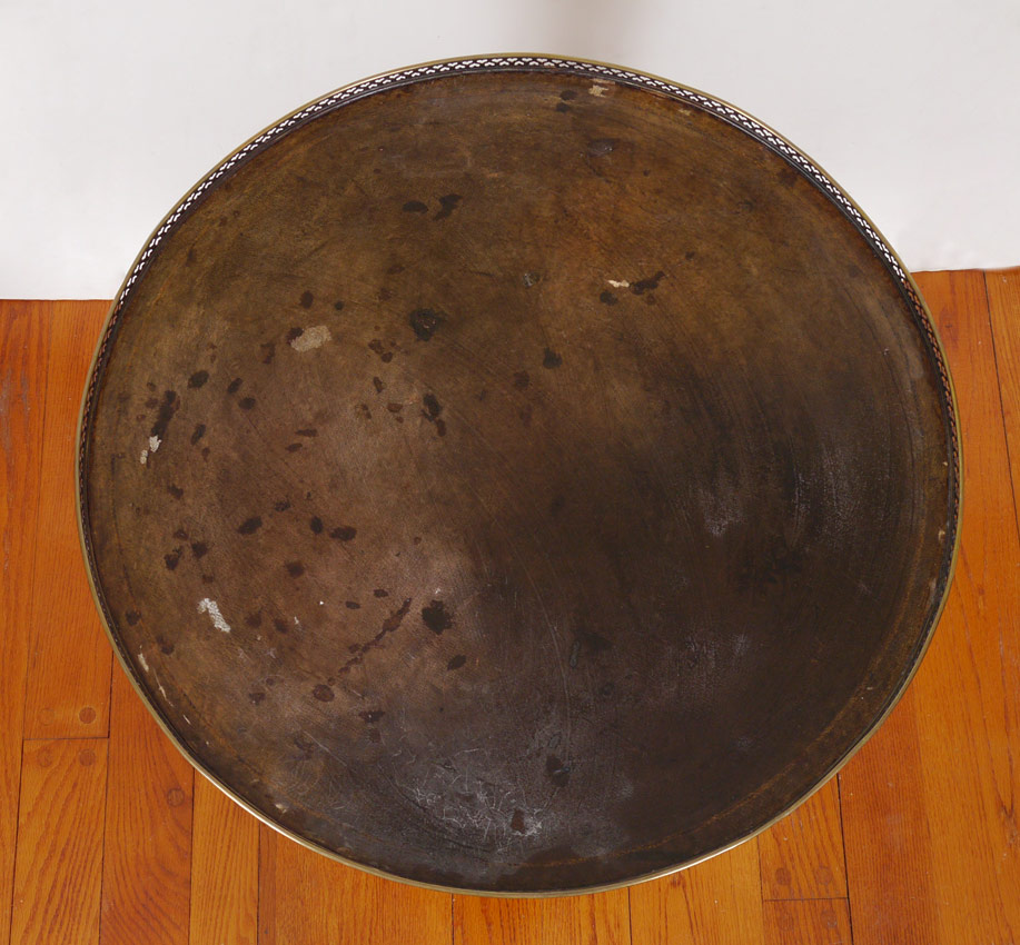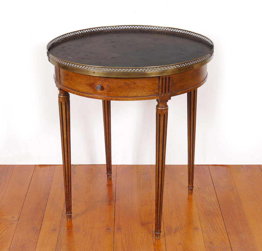 19TH CENTURY BOUILLOTTE LAMP TABLE: Pierced brass gallery with glass over painted faux leather top. Single drawer, fluted tapered legs. 29'' h. x 26''.