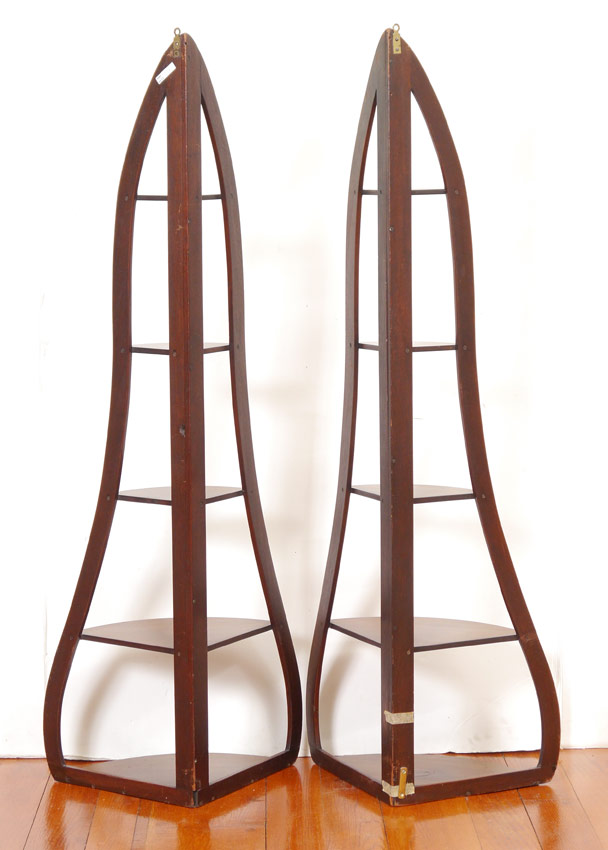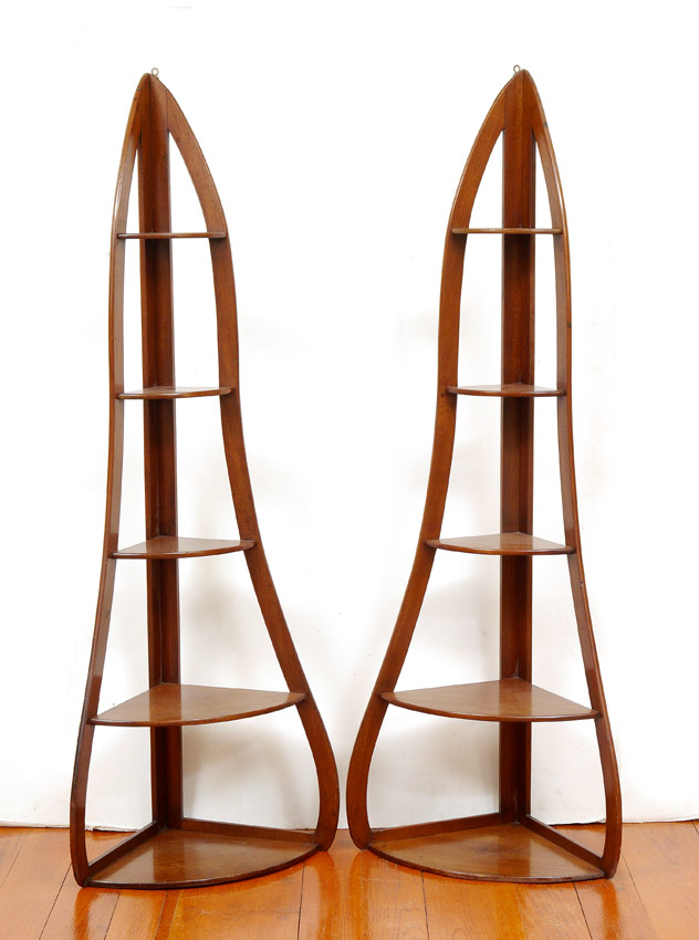 PAIR WILLIAM IV MAHOGANY CORNER SHELVES: 5 graduated shelf corner etagere, circa 1830, with shaped supports. 53 3/4'' h. x 19 3/4'' x 12 1/2''.