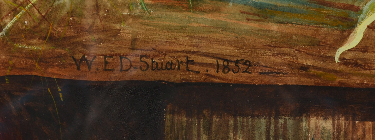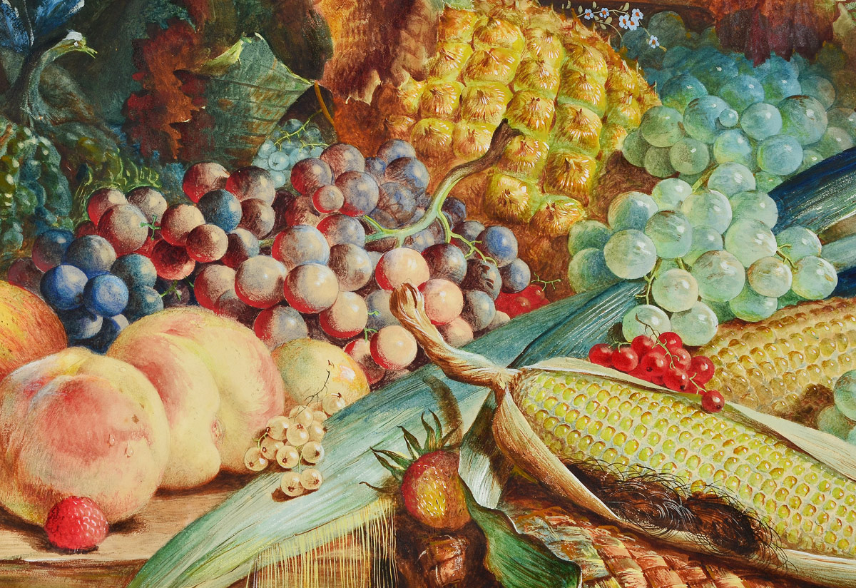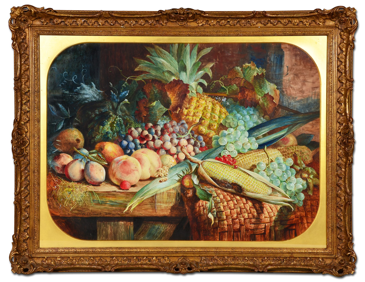 STUART, W.E.D., (British, 19th/20th C): Bountiful Still Life of Fruits and Vegetables, Gouache, 23 1/2'' x 32 1/2'', signed lower left and dated 1852, elaborate pierce-carved and gilded gesso frame, 32'' x 42'' x 2 1/4''.