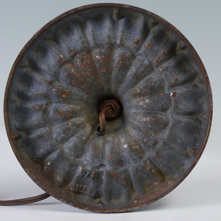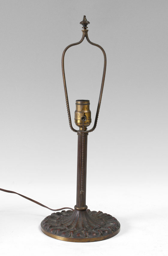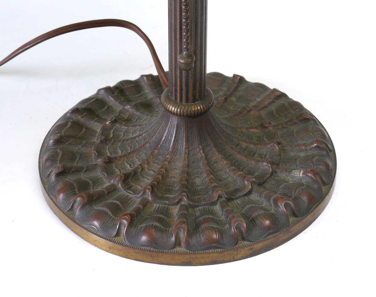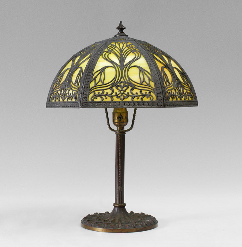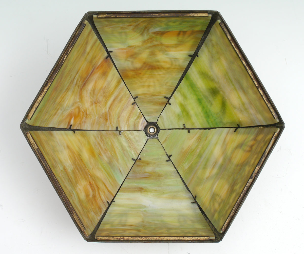 VINTAGE MILLER SLAG GLASS TABLE LAMP: Base stamped Miller 971 underneath, original Miller socket. 19'' h. to top of finial x 7 1/4''. 6 panel multi hued bent slag glass shade with filigree frame, 7'' h. x 14 1/4''.