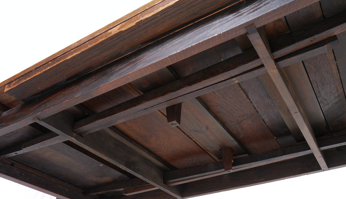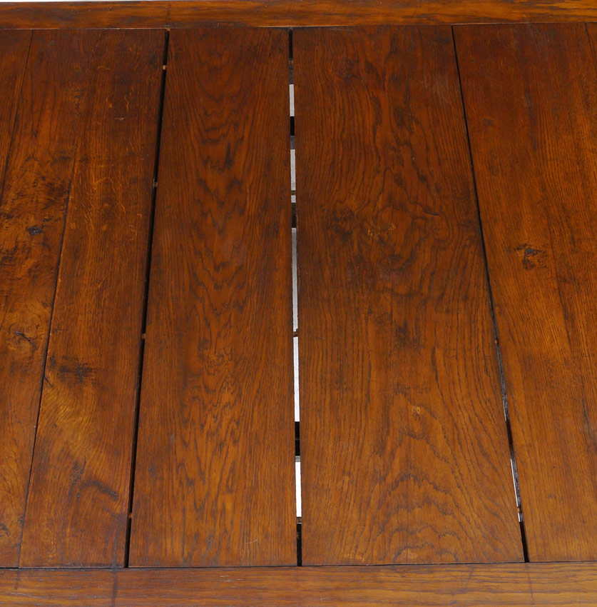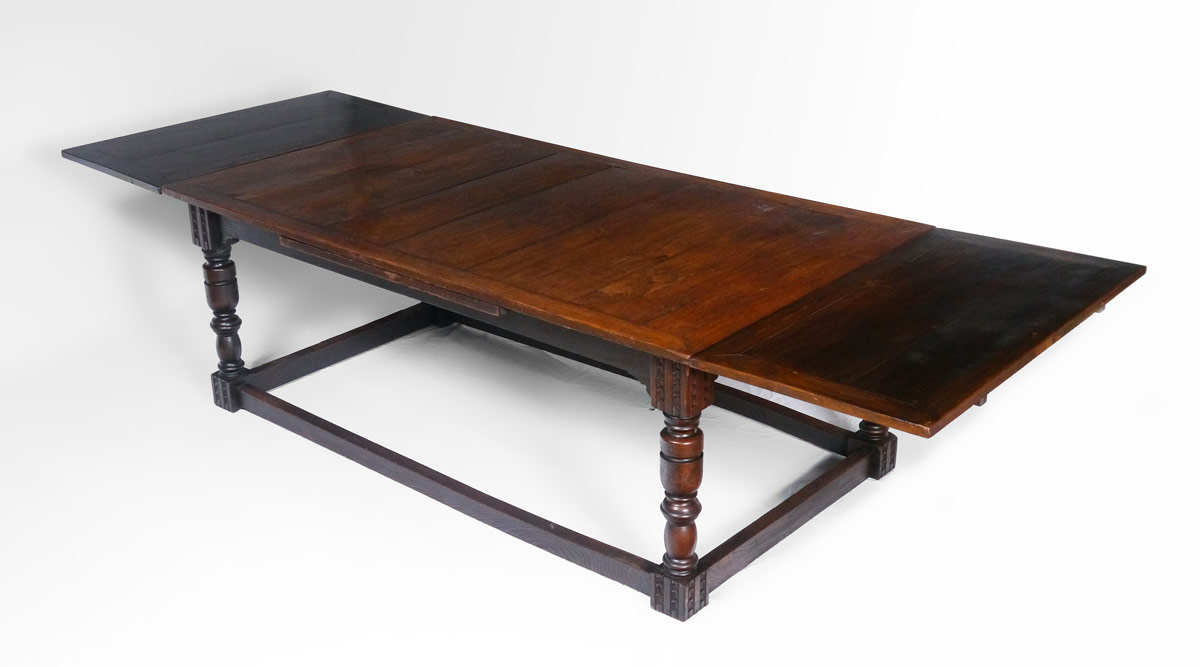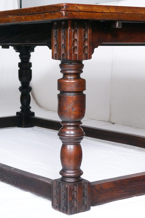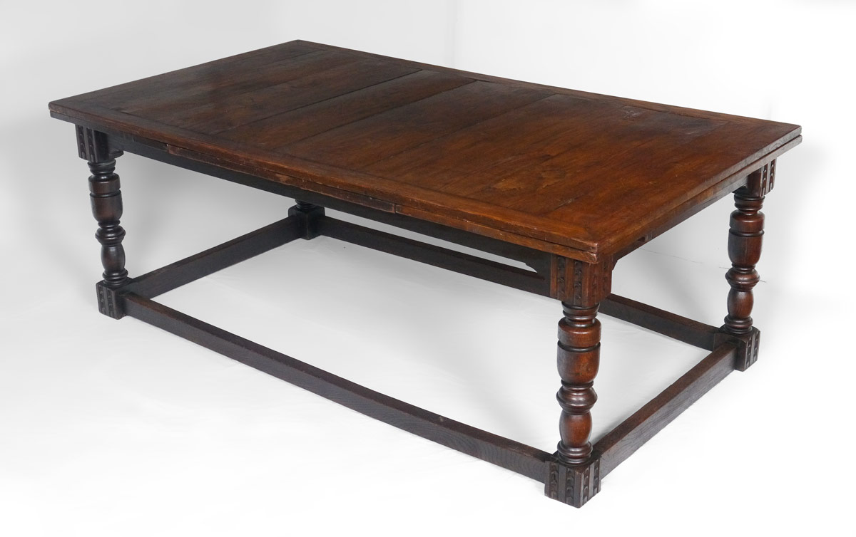 OAK DRAW LEAF DINING TABLE: Multi board top, carved and turned legs with four straight lower stretchers joining the legs at the feet. With leaves closed, 31'' h. x 72'' x 46 1/2''.