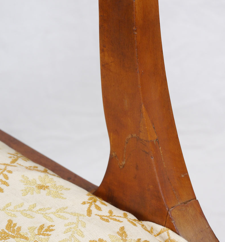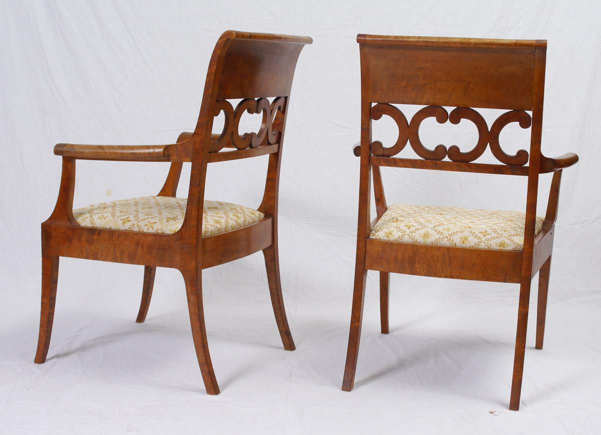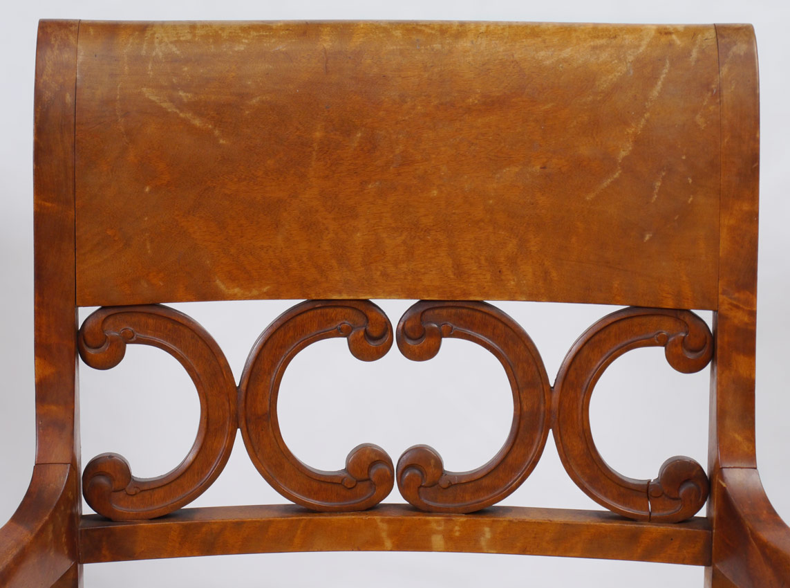 PAIR OF MAPLE SIDE CHAIRS: Carved and openwork back, outward scroll arm rests with shaped supports. Floral upholstered sheets. 38 1/2'' x 27'' x 24 1/2''.