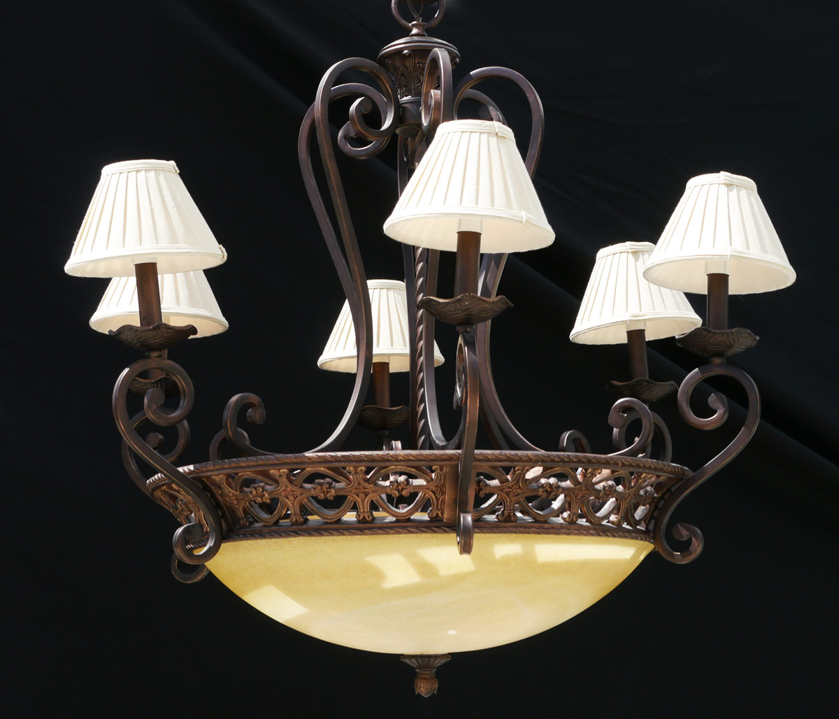 LARGE MODERN 6 LIGHT CHANDELIER: Lower frosted glass insert with 3 light fixture, 6 scroll arms rising from openwork rim. Cloth shades. Overall measures 36'' h. excluding chain x 35''.