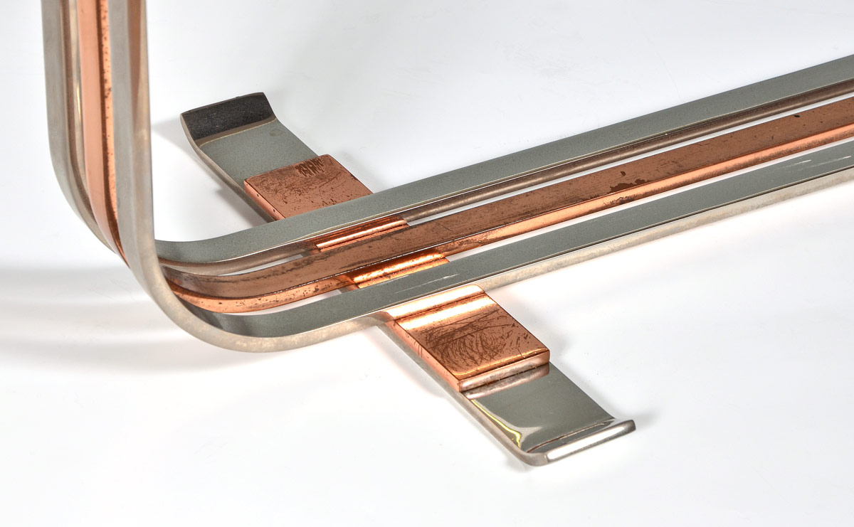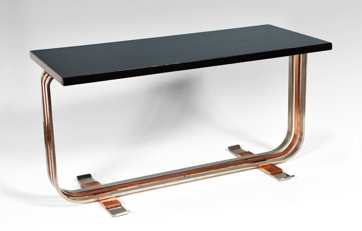 DONALD DESKEY MIXED METAL COFFEE TABLE: Painted black top with bent chrome and brass bands base. Measures 15 3/4'' h. x 30 3/4'' x 12''.