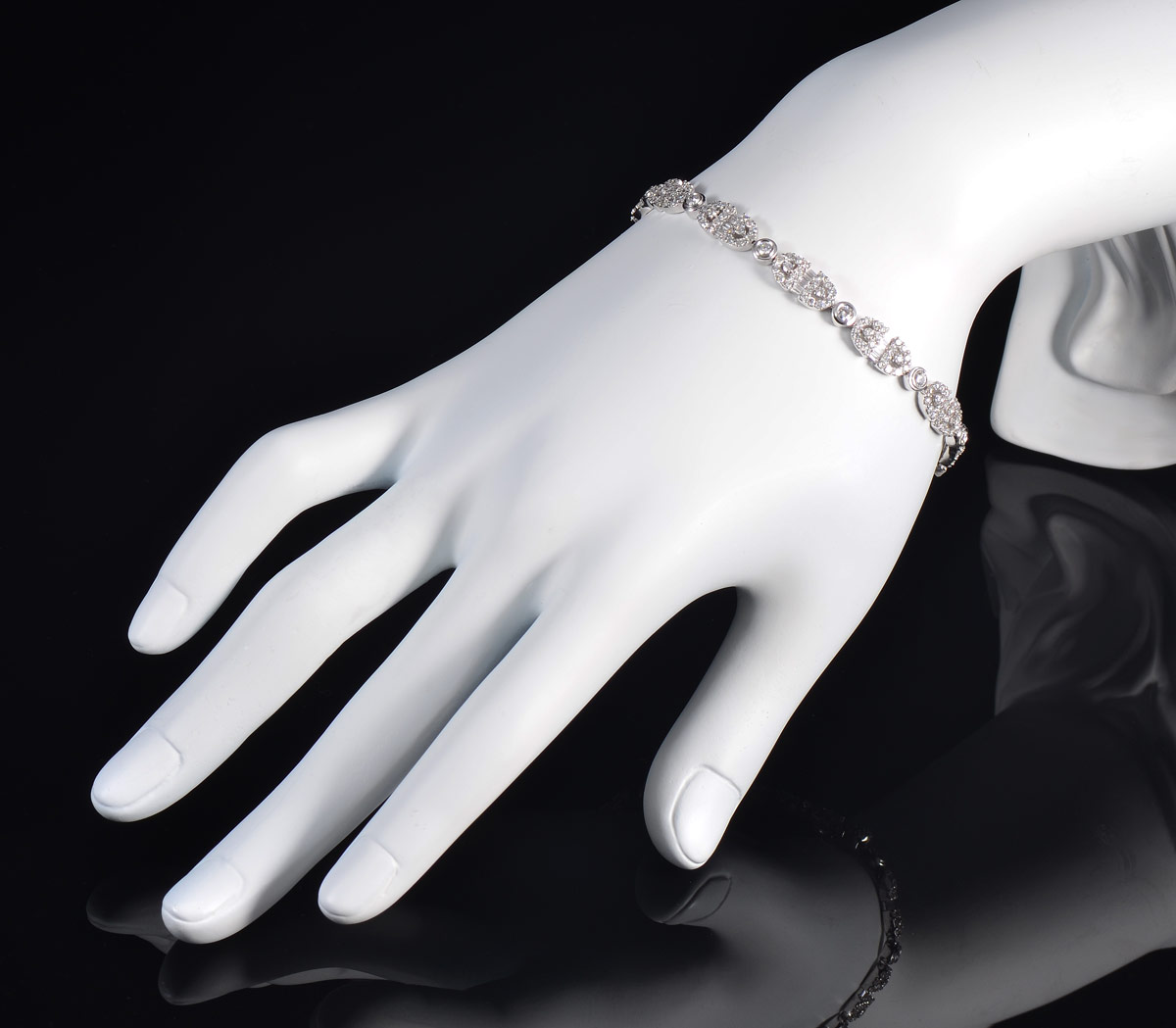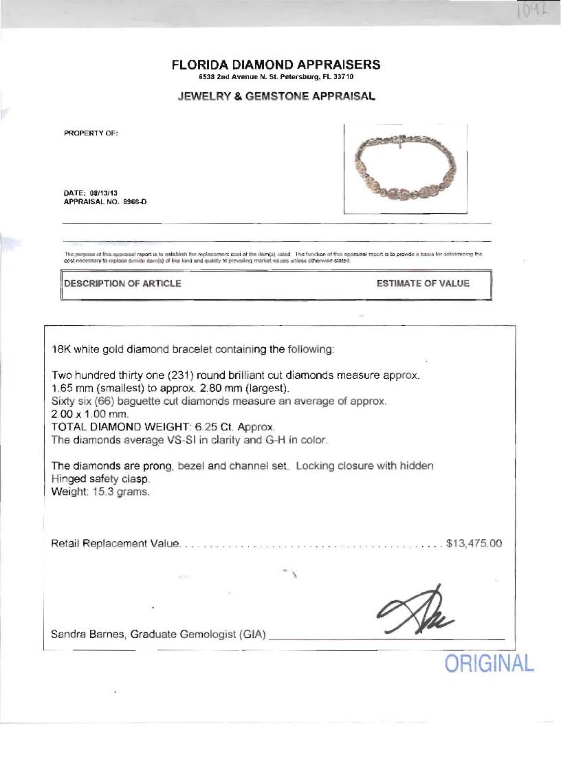 FINELY DETAILED 18K WHITE GOLD DIAMOND LINE BRACELET: A fanciful repeating design of 231 round brilliant and 66 baguette diamonds totaling approx. 6.25 Ct. Averaging VS-SI in clarity and G-H color. Prong, bezel and channel set. Length 7''. Weight 15.3 grams. Sold with current Florida Diamond Appraisers GIA graduates appraisal for $13,475.