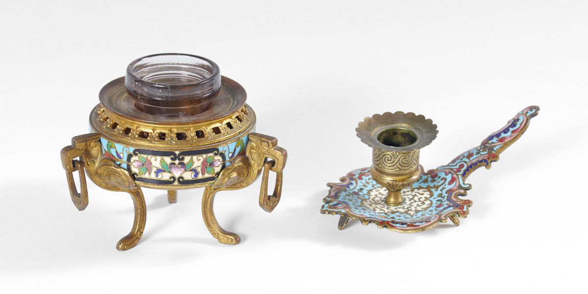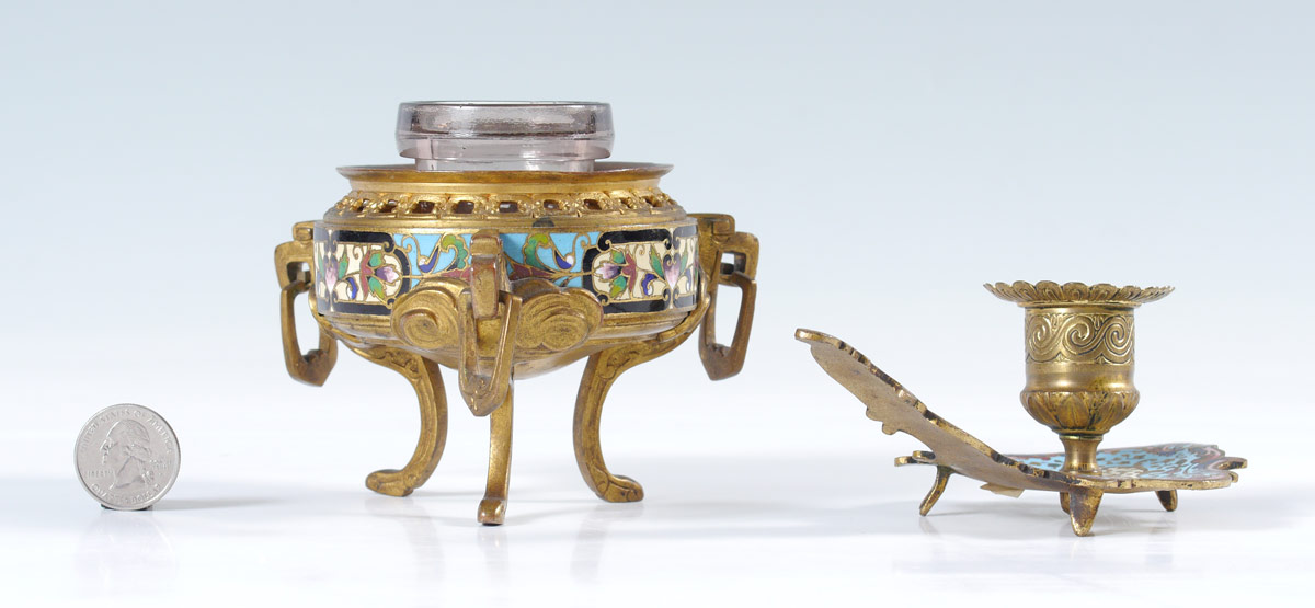 FRENCH CHAMPLEVE ENAMEL INKWELL & CANDLE STAND: 2 pieces to include 1) Inkwell with floral champleve enamel, figural bird head handles with rings, raised on 3 feet. Replacement glass insert. Overall 3'' h. x 4 1/2''. 2) Diminutive candle stand with foliate scroll motif enamel, overall 2'' h. x 6'' x 3 1/4''.