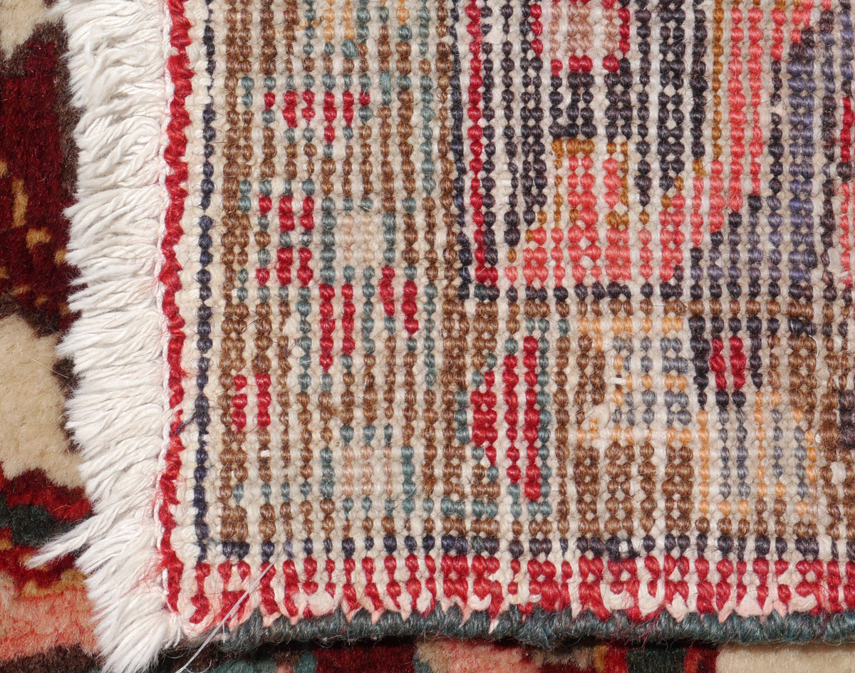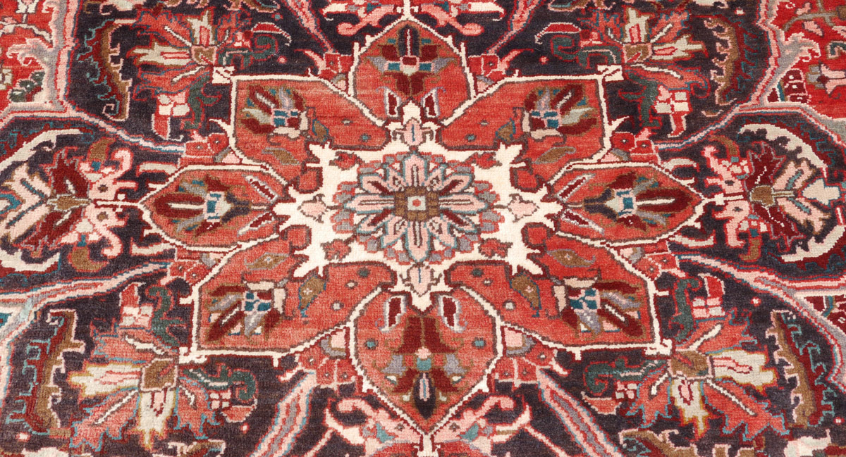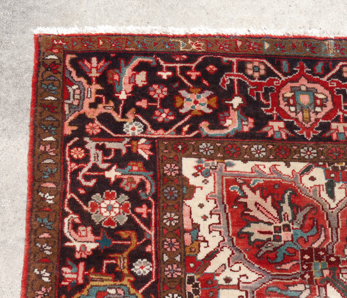 SEMI-ANTIQUE PERSIAN HERIZ HAND KNOTTED WOOL RUG, 9'7'' x 13'1'': This true Persian Heriz rug has a traditional design containing a large central medallion with a light colored center of white and beige followed by red with brown/black outer petals or lobes. There are black and white spandrels hanging from either end. The red field has white corners with a palmette in each one. The dark ground of the outer border of the rug is framed with brown guard borders that have small flower heads. The colors used in this rug are a little unusual but they make for an attractive rug that would go well with many styles of decor. Condition is good.